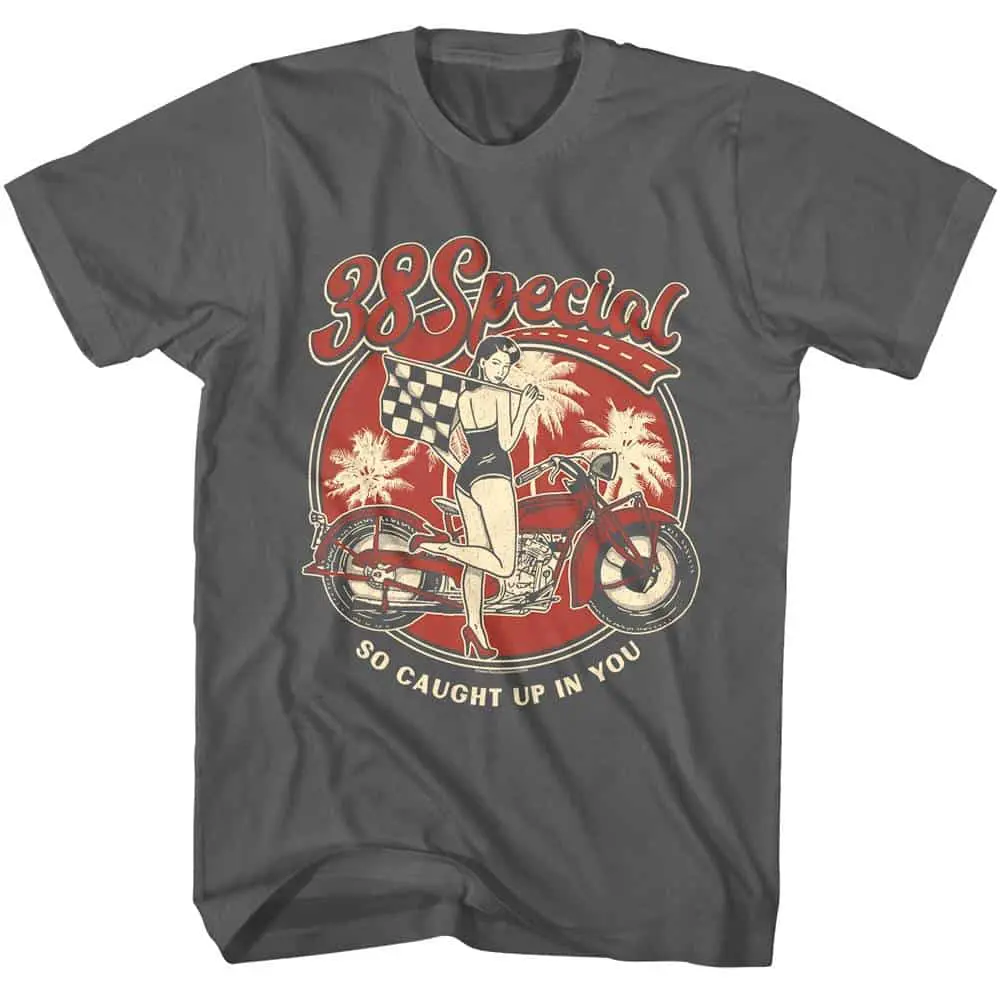To give it it’s real name .38 Special or spelled out as Thirty-eight Special, is a rock band formed by singer-guitarists Donnie Van Zant and Don Barnes in Jacksonville, Florida, in 1974. Donnie Van Zant, the younger brother of Lynyrd Skynyrd co-founder and frontman Ronnie Van Zant. 38 Special are known for their hit songs, including “Hold On Loosely” and “Caught Up in You”, among other Top 40 hits on the US Billboard Hot 100 during the 1980s and early 1990s. This epic, vintage-style 38 Special So Caught Up t-shirt looks like it came from a gig in the 80’s.
