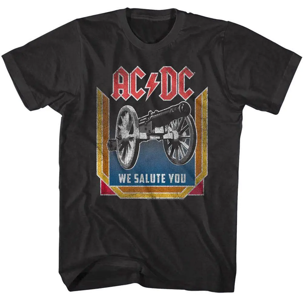 Part Scottish, part Aussie, 100% Rock Legends! The Young brothers and Bon Scott formed the band in Sydney, Australia in 1973 – that means the band is over 50 years old! AC/DC went from Dirty Deeds Done Dirt Cheap on the Highway to Hell to Back to Black in The Flick of the Switch! Rock megastardom followed, AC/DC have sold over 200 million albums worldwide and they are still working on new music. Despite the tragic loss of lead singer Bon Scott, he was replace with Brian Johnson and the band went from strength to strength. Wear some rock history, this cool ACDC We Salute You Cannon T-Shirt has a vintage style print with a distressed look as if you bought it at an AC/DC Concert Tour in the 80’s.