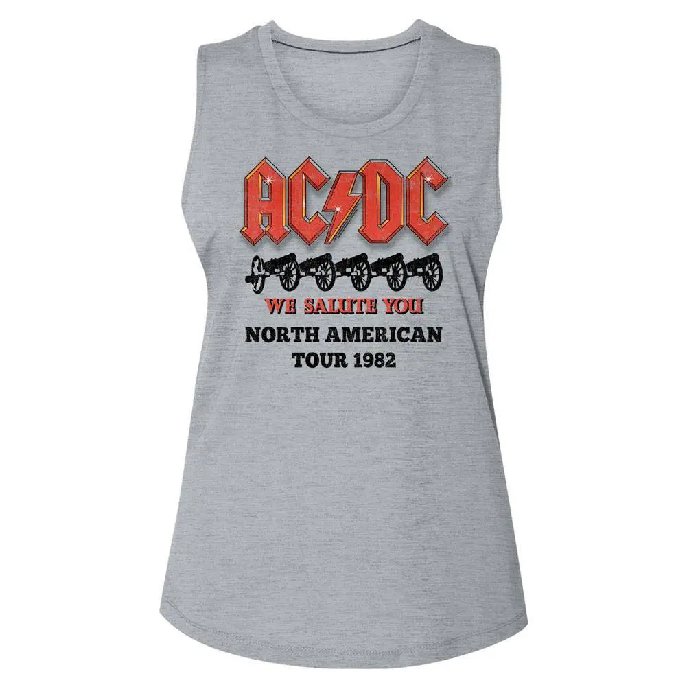 Part Scottish, part Aussie, 100% Rock Legends! The Young brothers and Bon Scott formed the band in Sydney, Australia in 1973 – that means the band is over 50 years old! AC/DC went from Dirty Deeds Done Dirt Cheap on the Highway to Hell to Back to Black in The Flick of the Switch! Rock megastardom followed, AC/DC have sold over 200 million albums worldwide and they are still working on new music. Despite the tragic loss of lead singer Bon Scott, he was replace with Brian Johnson and the band went from strength to strength. Wear some rock history, this cool ACDC We Salute You North American Tour 1982 Tank has a vintage style print with a distressed look as if you bought it at an AC/DC Concert Tour in the 80’s.