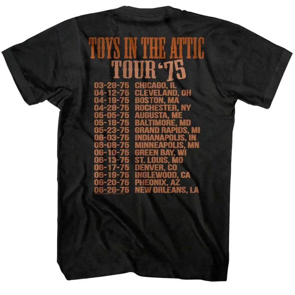 If it feels like Aerosmith has been around forever, they kinda have! The Bad Boys from Boston formed in in 1970, Steven Tyler & Co have churned out hit after hit on 15 successful studio albums – so successful that that Aerosmith are the best-selling American rock band of all time selling over 150 million albums (and counting)! They have won countless awards (4 Grammys, 6 AMA’s, 10 MTV VMA’s) – but who’s counting at this point! If you are a fan of the Bad Boys from Boston then Walk This Way and Get Your Wings… this vintage-style, faded Aerosmith Toys in the Attic Tour ’75 T-Shirt is definitely for you, it looks old-school like you got it from a gig in the 80’s.