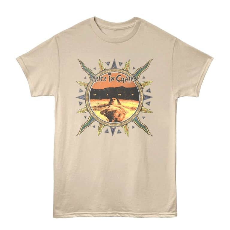 Alice in Chains has risen to international fame as part of the grunge movement of the early 1990s, along with other Seattle bands such as Nirvana, Pearl Jam, and Soundgarden. Although AIC has been labeled grunge by the mainstream media, the band as primarily heavy metal with some blues, rock and roll, maybe a touch of punk. Over the course of their career, Alice in Chains sound has also been described as alternative metal, doom metal, drone rock, hard rock and alternative rock BUT their sound is so unique and ever-changing that they cannot be boxed with a simple categorisation – but we can all agree, they Rock. Led by the ever-youthful Jerry Cantrell, Alice in Chains are a global success, releasing over 32 singles with 5 number 1’s. This faded, distressed graphic print Alice in Chains Dirt T-Shirt brings back Seattle gig-vibes from the 90’s which means you can look like a veteran fan.