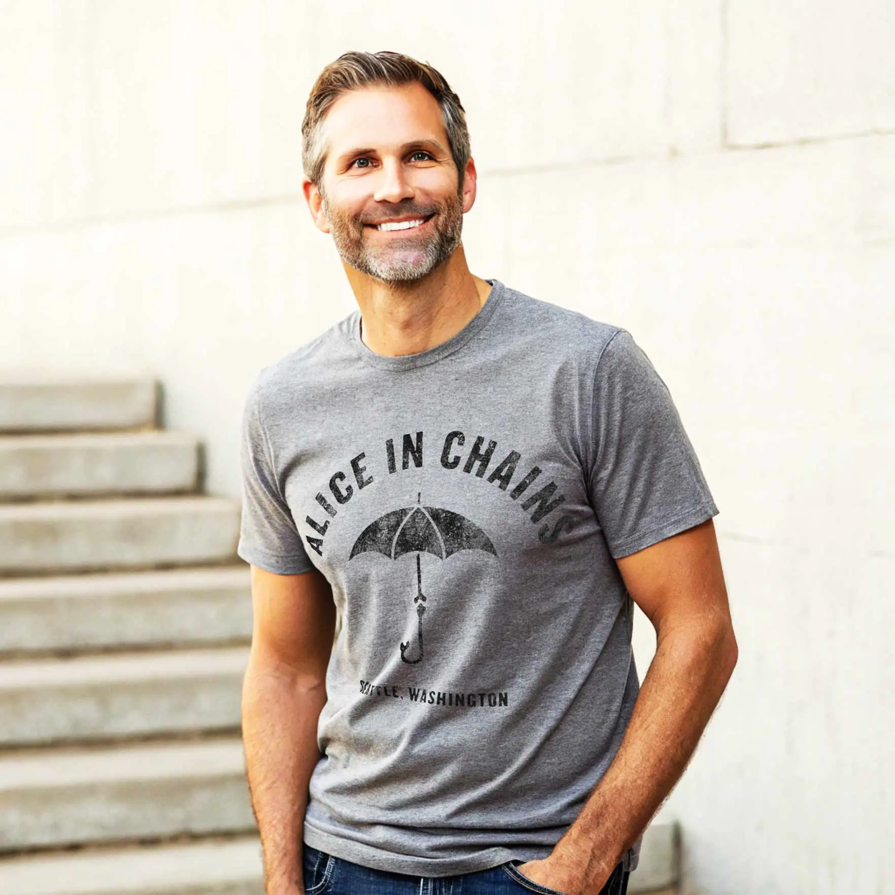Alice in Chains has risen to international fame as part of the grunge movement of the early 1990s, along with other Seattle bands such as Nirvana, Pearl Jam, and Soundgarden. Although AIC has been labeled grunge by the mainstream media, the band as primarily heavy metal with some blues, rock and roll, maybe a touch of punk. Over the course of their career, Alice in Chains sound has also been described as alternative metal, doom metal, drone rock, hard rock and alternative rock BUT their sound is so unique and ever-changing that they cannot be boxed with a simple categorisation – but we can all agree, they Rock. Led by the ever-youthful Jerry Cantrell, Alice in Chains are a global success, releasing over 32 singles with 5 number 1’s. This faded, distressed graphic print Alice in Chains Rainy Seattle T-Shirt brings back Seattle gig-vibes from the 90’s which means you can look like a veteran fan.