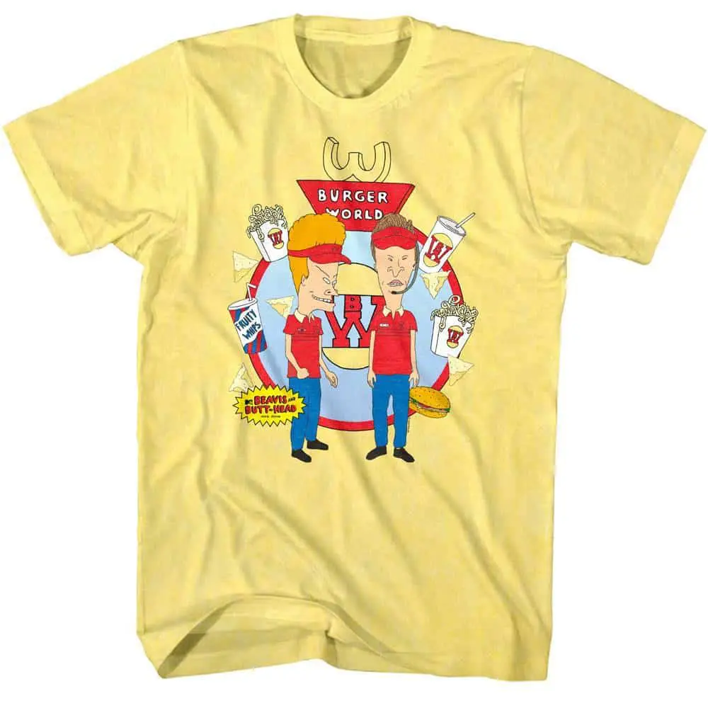 MTV launched the Beavis and Butt-Head cartoon series in 1993 and somehow is defined American teen life in the 90’s! The dumb & dumber duo of Beavis and Butt-Head, both voiced by creator Mike Judge are teenage slackers who lack intelligence and any skills to attract women, so instead love being silly and lowbrow – it’s what they do best. These useless couch potatoes spend their days listening to heavy metal music, insulting each other, watching porn, eating junking food, obsessing with sex and laughing at anything almost dirty – basically the basis of the average American teen! It was so popular that Beavis and Butt-head has a new remake. This vintage rocker style Beavis and Butthead Burger World t-shirt is perfect for the Cornholio in all of us!