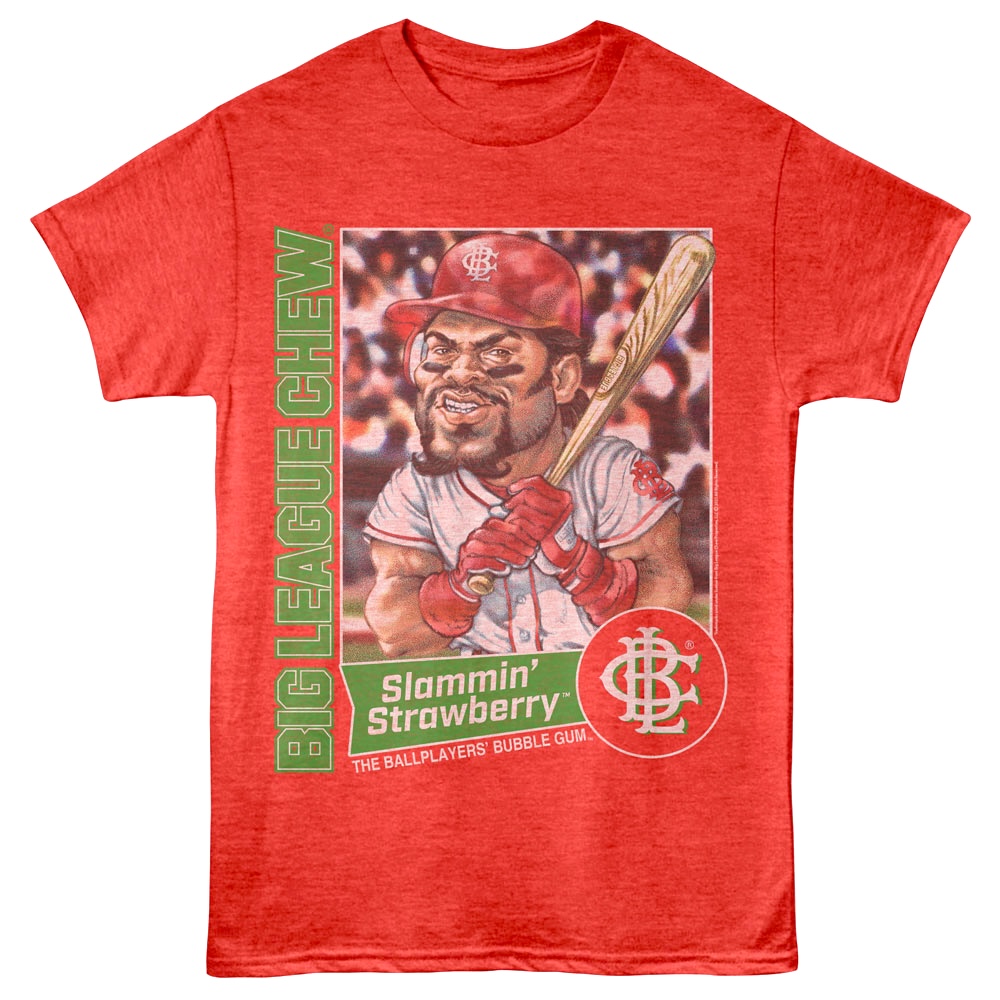 In short, Big League Chew is an original American brand of bubble gum made to resemble chewing tobacco like the old baseball players used to use… but for kids! Invented by a baseball player, Big League Chew is shredded bubble gum sold in pouches. The original advertising slogan throughout the 1980s, which is still featured today, was, “You’re in the big leagues when you’re into Big League Chew!” It currently bills itself as “The Hall of Fame Bubble Gum”, bearing an official endorsement from the Baseball Hall of Fame. All big kids need this graphic Big League Chew Red Strawberry Men’s t-shirt
