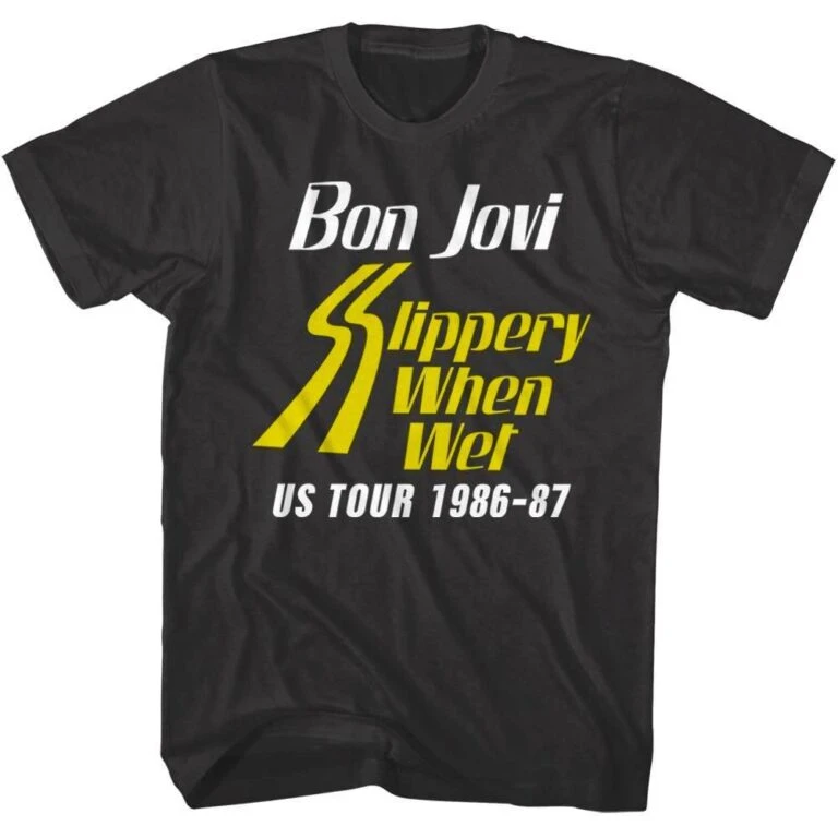New Jersey’s finest since Runaway in 1983. Prolific hitmakers for 3 decades, Bon Jovi have performed more than 2,700 concerts in over 50 countries for more than 34 million fans… Oh and they’re still going strong! From Slippery When Wet to Have a Nice Day til now, Bon Jovi have us all Livin’ on a Prayer. How prolific? Well they are in the top 10 highest-selling rock bands of all time. They are modern rock legends and this cool graphic Bon Jovi Slippery When Wet Tour 1986 T-Shirt is timeless as well as vintage looking – Jon would approve.