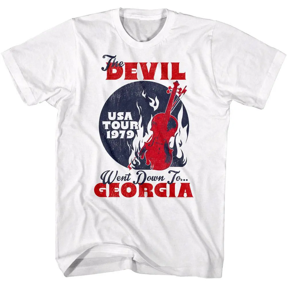 Talented country singer and musician, Charles Daniels could play guitar, fiddle and banjo from his teens. His music covered multiple genres in a career spanning five decades, including southern rock, country rock, country, bluegrass, blues and gospel. CDB was best known for his number-one country hit “The Devil Went Down to Georgia”. Virtually all of his charting singles was credited to the Charlie Daniels Band, but make no mistake Charlie was the driving force. This vintage-style graphic Charlie Daniels Band Devil Went Down to Georgia USA Tour T-Shirt has a faded vibe as if you bought it at a show back in the 70’s.