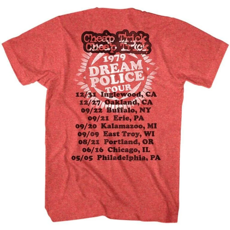 Even though they started life in Rockford, Illinois, Cheap Trick found success in a roundabout way – they first found fame in Japan before more widespread acclaim. Cheap Trick are renown live performers (even today), they have toured consistently, well over 5,000 gigs til now. From Budokan to I want you to Want Me, Cheap Trick’s songs have garnered much radio air-time. If you have ever been to a Cheap Trick show you’ll instantly recognise the energy – they know how to rock a show. This vintage-style Cheap Trick Dream Police Tour 1979 T-Shirt looks like it came from an old-school gig in the 80’s and I want you to want this tee!