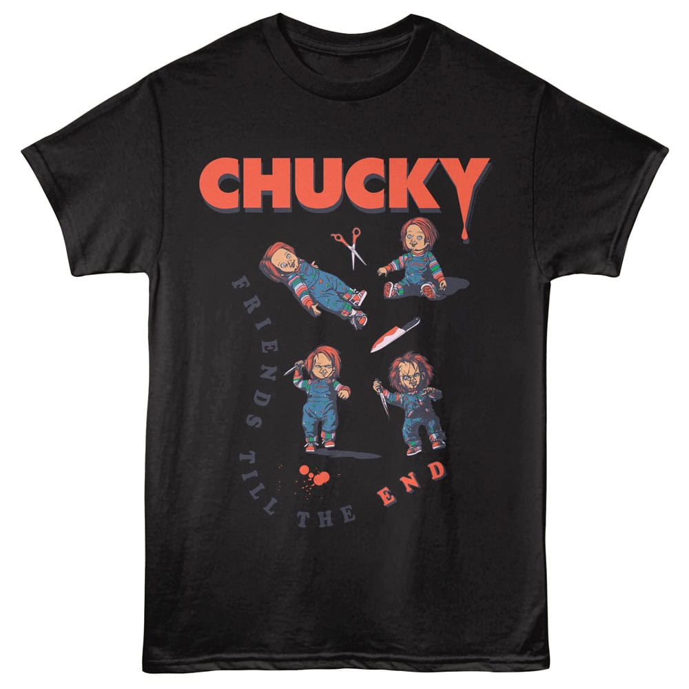 The horror franchise Child’s Play also known as Chucky (after the doll) was such a cult classic that it spawned 8 movies, comic books, wrestling videos, short films, a video game and currently a TV series obviously called Chucky. Child’s Play is a weird horror comedy that focus on a “Good Guy” doll called Chucky, that was possessed by a notorious serial killer who escaped death by performing a voodoo ritual to transfer his soul into the doll. The franchise was so successful that Child’s Play also won a Saturn Award for Best Horror Film. You could never be scared of a doll in this kitschy graphic Child’s Play Chucky Friends Till The End t-shirt, designed to ward off knife-wielding toys.