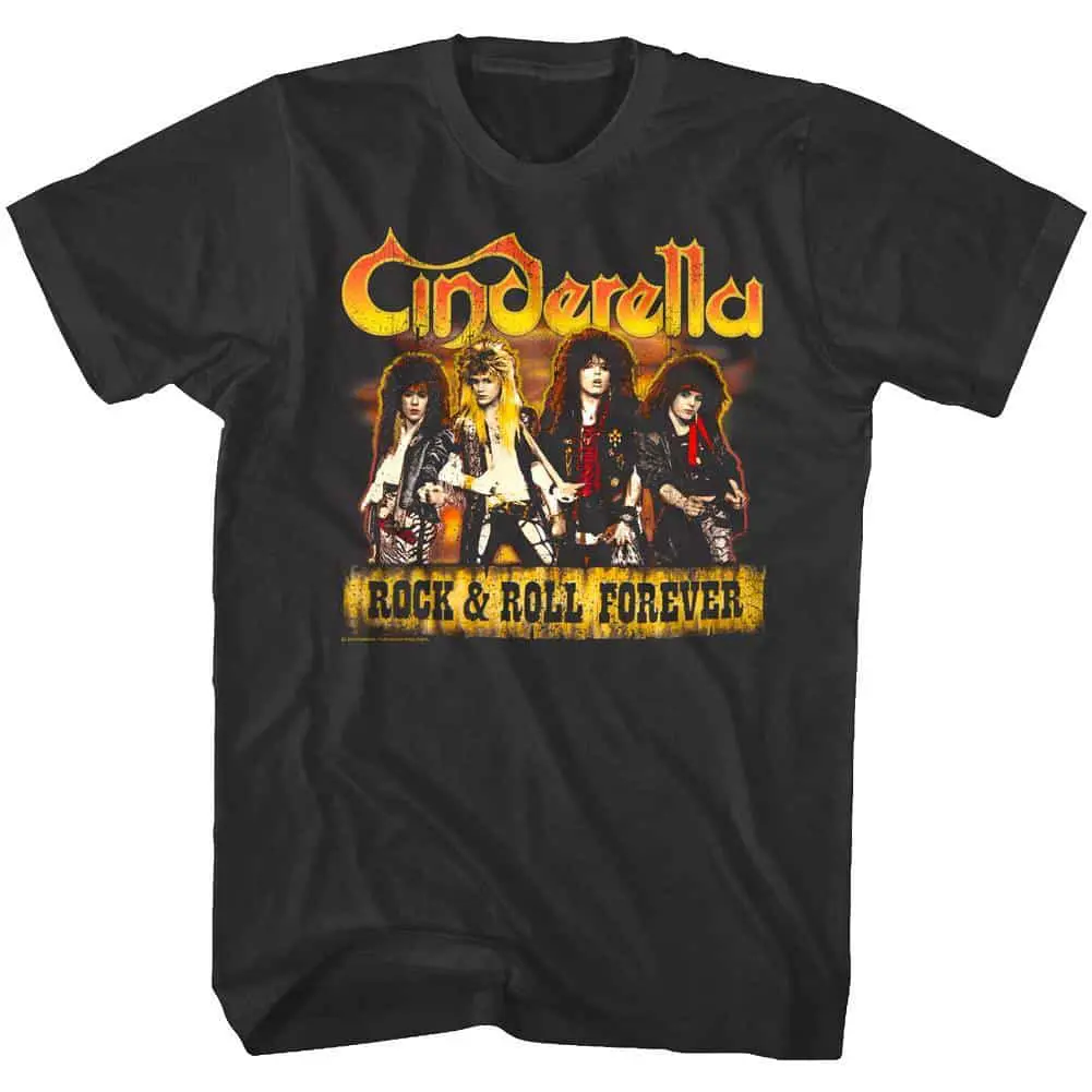 No, not the Disney princess obviously. This Cinderella is the Philly heavy metal rockers who were pioneers of the American glam rock and hair metal sounds. Cinderella’s albums Night Songs and Long Cold Winter spawned their bestselling hits and launched them to rock stardom. They had some recent tragedy in July 2021 when 2 Cinderella band members died on the same day. Keep the glam-rock heavy-metal memories alive in this epic graphic Cinderella Rock & Roll Forever T-Shirt which has a faded look as if you bought it at a concert in the 80’s.