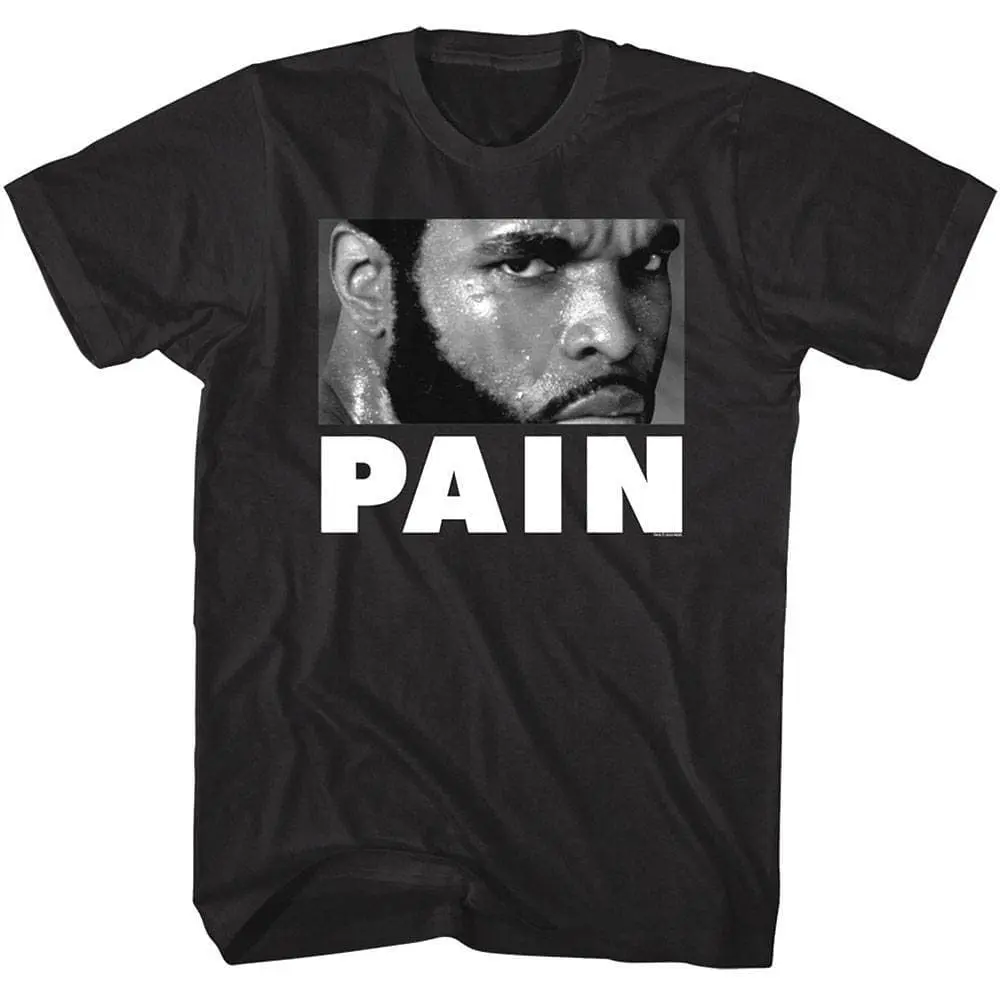 The greatest boxing movie franchise in film history! There are 6 movies following Rocky Balboa (played by Sylvester Stallone) fighting his way up from the streets to the big time. This is followed by the Rocky Creed movies, where Rocky becomes coach and mentor to Adonis Creed (the son of nemesis Apollo Creed from Rocky 1-4). The opposing boxers became notorious heels themselves like Mr. T’s ultra-violent Clubber Lang and the unstoppable Russian, Ivan Drago. The original 6 movies were mostly written and directed by Sly Stallone himself. Legendary movies, memorable characters, invoke the heroic strength of Rocky Balboa with this inspirational boxing Rocky Clubber Lang Big Pain t-shirt and you’ll always have Mighty Mick in your corner.