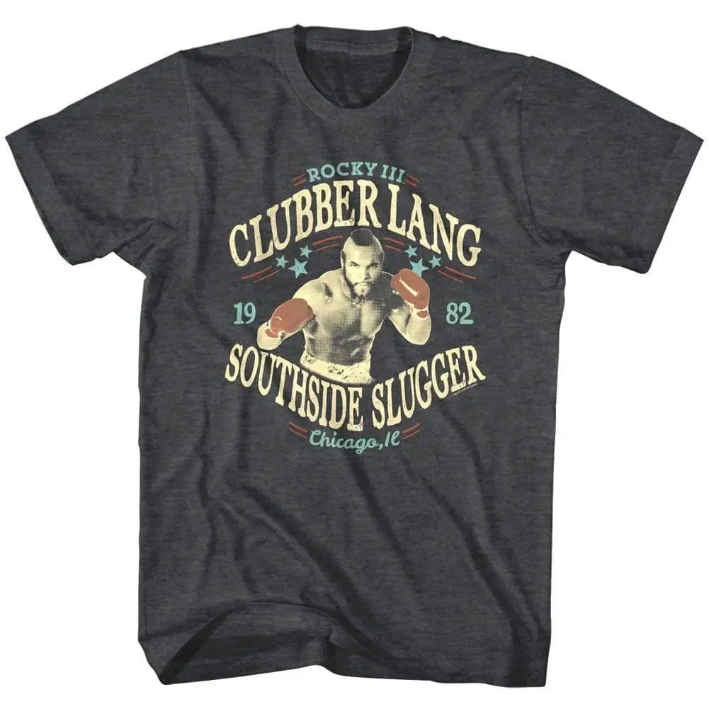 The greatest boxing movie franchise in film history! There are 6 movies following Rocky Balboa (played by Sylvester Stallone) fighting his way up from the streets to the big time. This is followed by the Rocky Creed movies, where Rocky becomes coach and mentor to Adonis Creed (the son of nemesis Apollo Creed). The original 6 movies were mostly written and directed by Sly Stallone himself. Legendary movies, memorable characters, invoke the heroic strength of Rocky Balboa with this inspirational boxing Rocky Clubber Lang Southside Slugger t-shirt