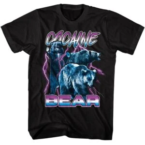 Believe it or not but the movie Cocaine Bear is (very, very, very loosely) based on a true story from the 80’s of a bear in the forest that accidentally gets high on coke! This version of Cocaine Bear is directed by Elizabeth Banks (yes Effie Trinket from Hunger Games!) and starring Ice Cube’s oldest son, O’Shea Jackson Jr. In real-life, Cocaine Bear died after ingesting all that coke and is on display in the Kentucky Fun Mall in Lexington. It takes some real imagination to think up the movie version, and I’d like to think that this awesome Cocaine Bear Movie Logo T-Shirt is designed by narcotics-fuelled forest predators too.
