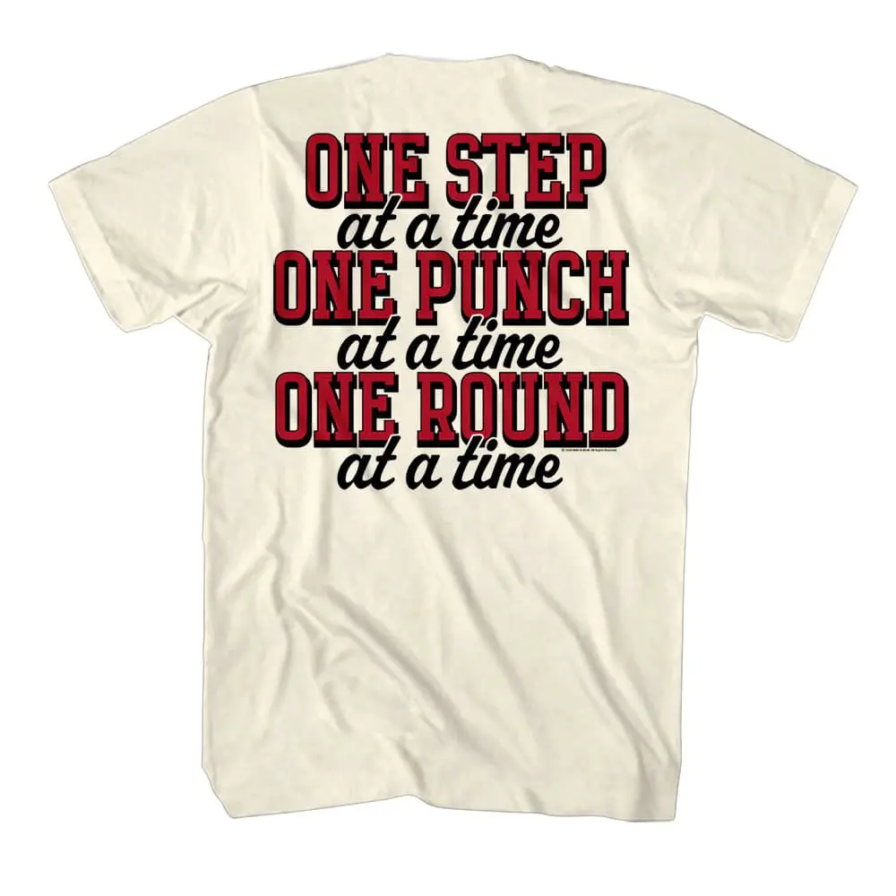 The greatest boxing movie franchise in film history! There are 6 movies following Rocky Balboa (played by Sylvester Stallone) fighting his way up from the streets to the big time. This is followed by the Rocky Creed movies, where Rocky becomes coach and mentor to Adonis Creed (the son of nemesis Apollo Creed from Rocky 1-4). The opposing boxers became notorious heels themselves like Mr. T’s ultra-violent Clubber Lang and the unstoppable Russian, Ivan Drago. The original 6 movies were mostly written and directed by Sly Stallone himself. Legendary movies, memorable characters, invoke the heroic strength of Rocky Balboa with this inspirational boxing Rocky Creed Philadelphia 2015 One Step t-shirt and you’ll always have Mighty Mick in your corner.