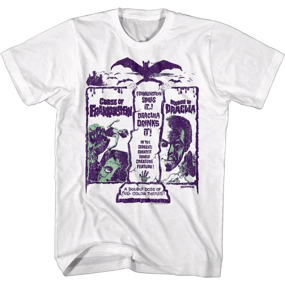 Hammer Film Productions aka the Hammer House of Horror is a British film company based founded in London in 1934, the company is best known for Gothic horror movies from the 1950s until the 1970s. Many of these involved classic horror characters such as Baron Victor Frankenstein, Count Dracula, the Mummy, which Hammer reintroduced to audiences by filming them in vivid colour for the first time. During its most successful years, Hammer dominated the horror film market, enjoying worldwide distribution and considerable financial success. This old-school Hammer Horror Curse of Frankenstein v Horror Of Dracula t-shirt is printed in a faded, distressed style to look like are from the vintage cinema era.