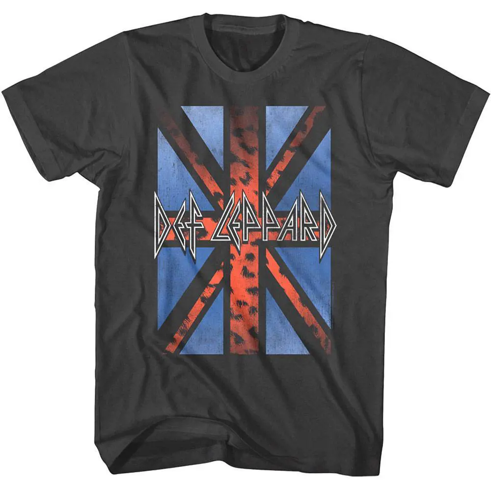 Listen to the Hysteria and let it Adrenalize you, it can only be the Sheffield (UK) rockers Def Leppard! Yeah! They won’t leave you High n’ Dry as you rock On Through the Night! Def Leppard have sold over 100 million albums worldwide and were inducted in the Rock and Roll Hall of Fame in 2019 and the Societees Rock T-Shirt Hall of Fame in 2021. The Brit rockers had a unique rise to the top in their 49 years (so far), featuring a 1-armed drummer, a tragic death, but Def Leppard regrouped and reinvented successfully – they still tour today. Wear some rock nostalgia, this cool Def Leppard Leopard UK Flag T-Shirt is vintage style print with a distressed look as if you bought it at an Def Leppard Rock Concert in the 80’s.