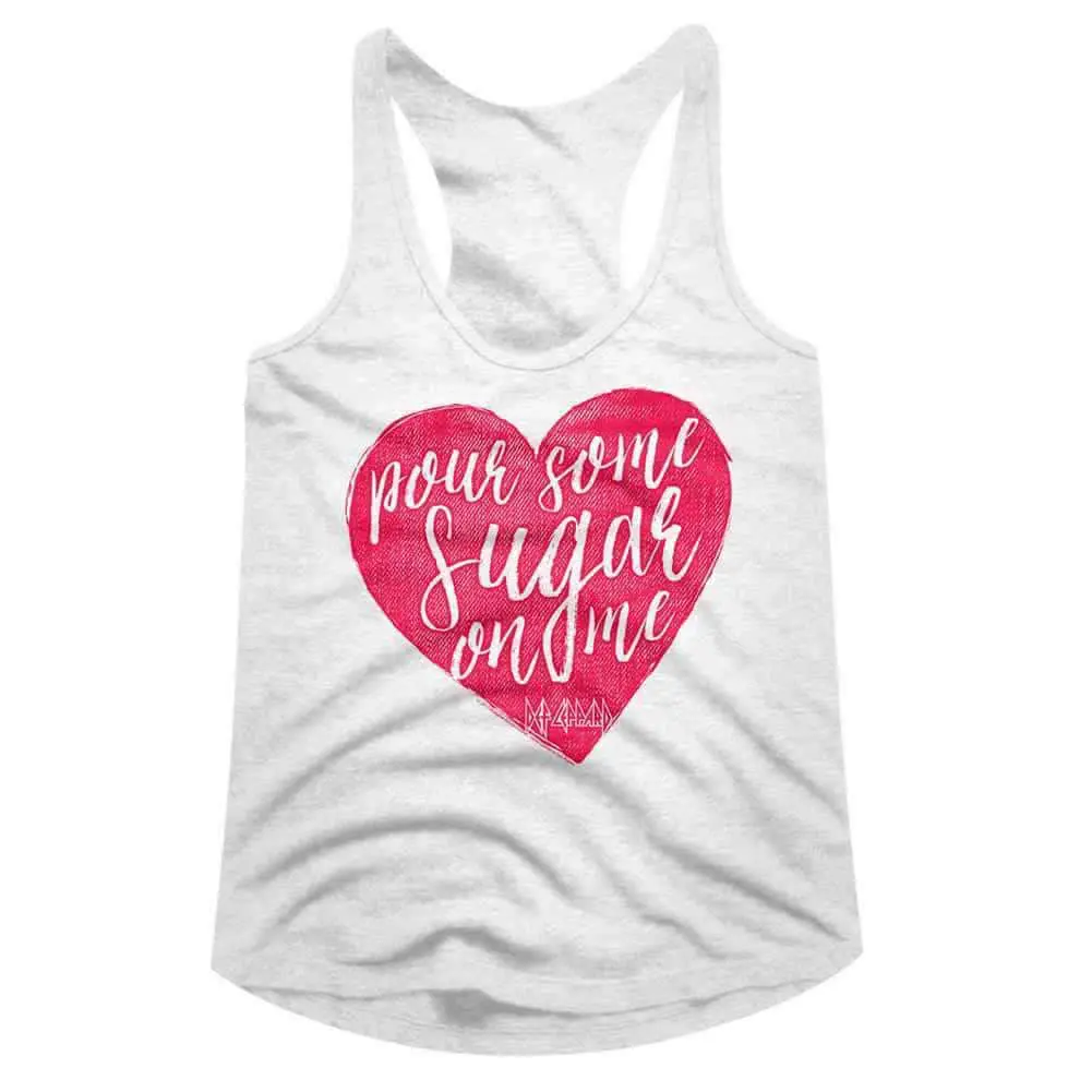Listen to the Hysteria and let it Adrenalize you, it can only be the Sheffield (UK) rockers Def Leppard! Yeah! They won’t leave you High n’ Dry as you rock On Through the Night! Def Leppard have sold over 100 million albums worldwide and were inducted in the Rock and Roll Hall of Fame in 2019 and the Societees Rock T-Shirt Hall of Fame in 2021. The Brit rockers had a unique rise to the top in their 49 years (so far), featuring a 1-armed drummer, a tragic death, but Def Leppard regrouped and reinvented successfully – they still tour today. Wear some rock nostalgia, this cool Def Leppard Sugar Heart Tank Top is vintage style print with a distressed look as if you bought it at an Def Leppard Rock Concert in the 80’s.