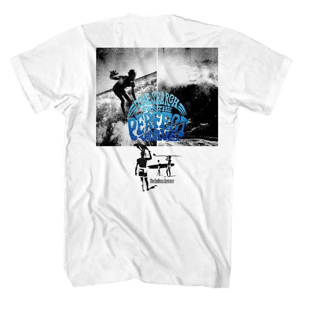The Endless Summer is more than just a surf documentary film from 1966 directed, produced, edited and narrated by Bruce Brown. The film follows surfers Mike Hynson and Robert August on a surfing trip around the world. They travel to the coasts of Australia, New Zealand, Tahiti, Hawaii, Senegal Ghana, Nigeria and South Africa in a quest for new surf spots while introducing locals to the sport along the way. It has become a timeless masterpiece that continues to capture the imagination of every new generation of surfer and so a sequel was made in 1994. This classic Bruce Brown Film is represented on these sizzling graphic Endless Summer Search for the Perfect Wave T-Shirt, designed to look vintage like they came from a surf shop in the ’60’s.