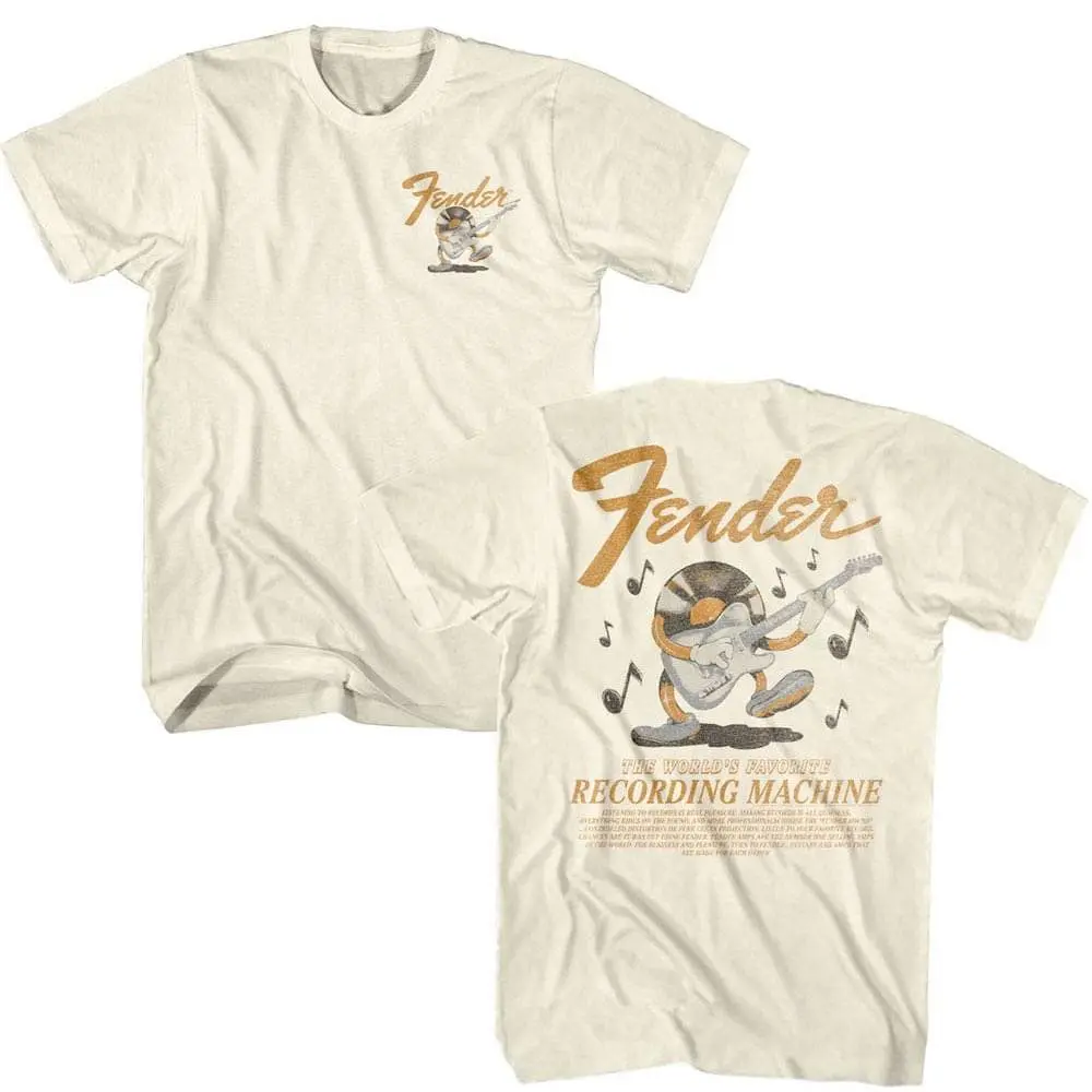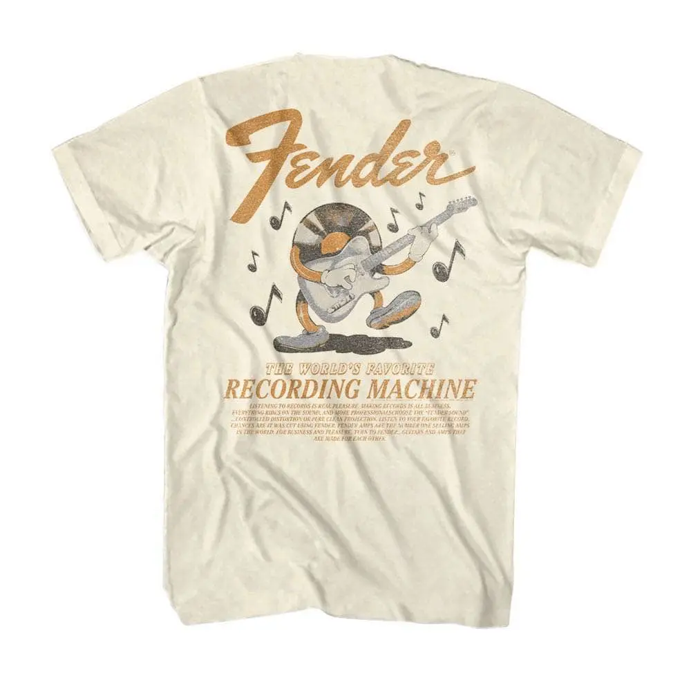 The Fender Musical Instruments Corporation is an American manufacturer and marketer of musical instruments and amplifiers. Fender is best known for its electric guitars and bass guitars, particularly the Stratocaster, Telecaster, Jaguar, and the Jazzmaster. The company was founded in Fullerton, California, by Clarence Leonidas “Leo” Fender in 1946. Many rock legends have their own custom Fender guitars and many wannabes aspire to own one. Look like you are part of the band with this awesome, vintage-style Fender Vinyl Recording Machine t-shirt.