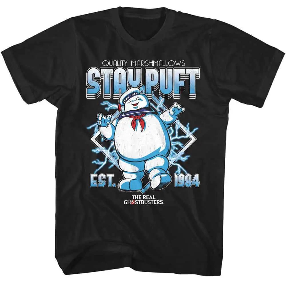 The original adventures of the paranormal investigators of New York City aka The Real Ghostbusters involves solving ghostly mysteries of haunted hotels, chasing ghost gangsters, capturing rogue spirits, stop mad scientists and more. The Real Ghostbusters was an 80’s cartoon TV series created as a spin-off of the original movie following the exploits of the original Ghostbusters – Egon, Ray, Winston, Peter and Janine. Put the uniform on and join the adventure with this ghostly graphic Ghostbusters Electrical Stay Puft t-shirt approved by Slimer.