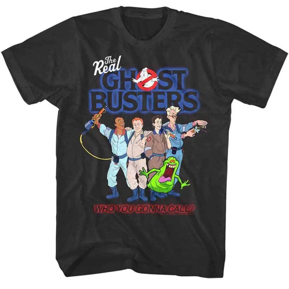 The original adventures of the paranormal investigators of New York City aka The Real Ghostbusters involves solving ghostly mysteries of haunted hotels, chasing ghost gangsters, capturing rogue spirits, stop mad scientists and more. The Real Ghostbusters was an 80’s cartoon TV series created as a spin-off of the original movie following the exploits of the original Ghostbusters – Egon, Ray, Winston, Peter and Janine. Put the uniform on and join the adventure with this ghostly graphic Ghostbusters Squad Who You Gonna Call t-shirt approved by Slimer.