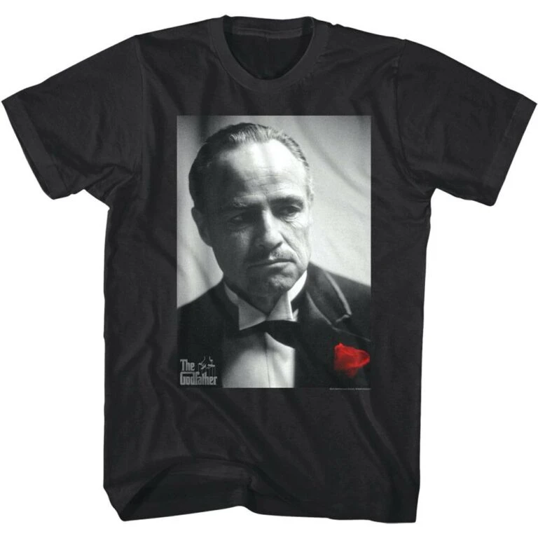The legendary crime trilogy, The Godfather, was the masterpiece directed by Francis Ford Coppola and inspired by the novel by Italian American author Mario Puzo enjoy cult status among Mafia movie fans. The Godfather films follow the trials of the Italian American mafia Corleone family whose patriarch, Don Vito Corleone played by Marlon Brando, rises to be a major figure in American organized crime. The Don’s son, Michael Corleone played by Al Pacino, wants to stay out of the family business but is gradually drawn in, his journey goes from New York to Sicily and back again. So leave the cannoli and take this vintage style Godfather Don Corleone Red Rose t-shirt, this is an offer you cannot refuse