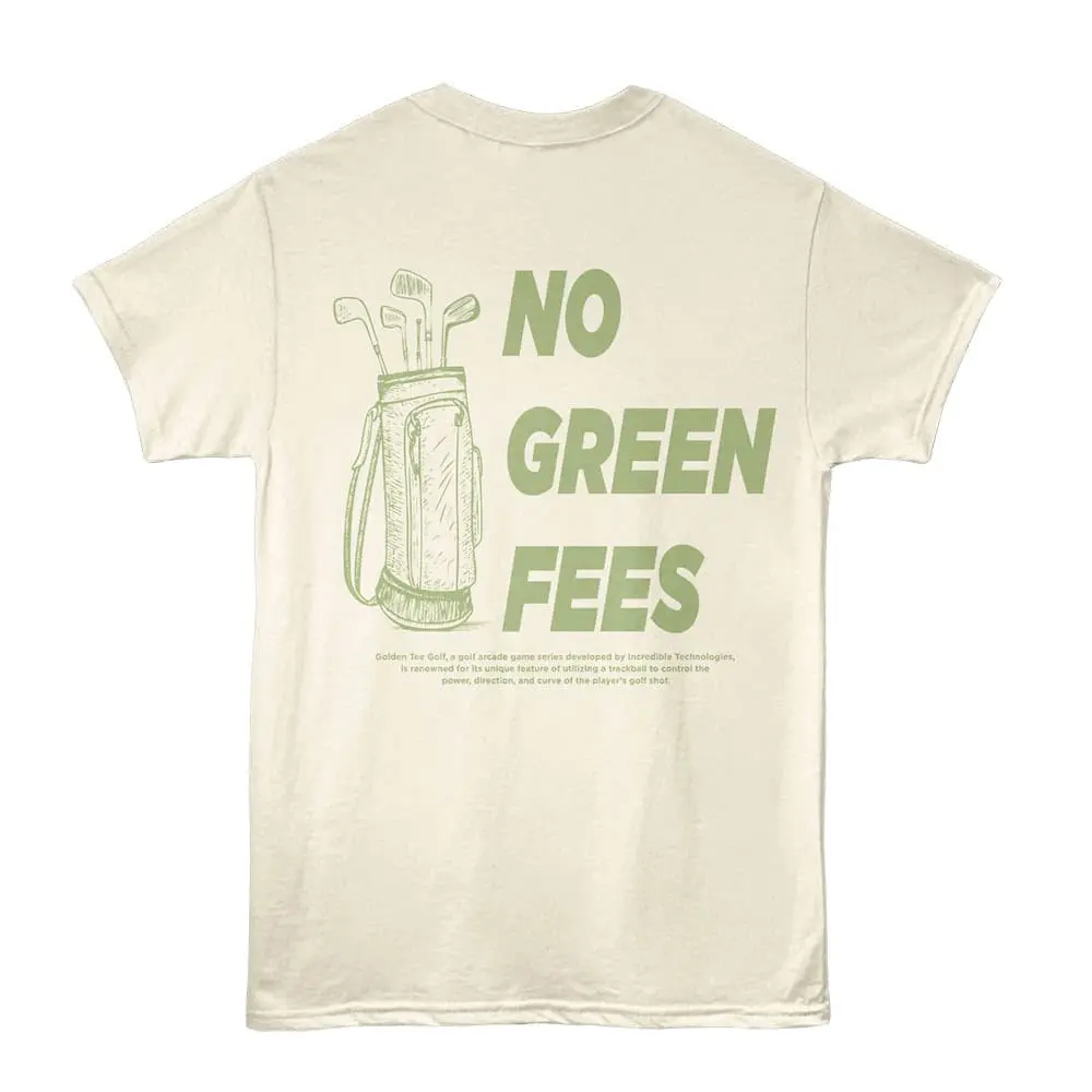 T-shirt with "Golden Tee Owner" and "No Green Fees" golf-themed print, casual golf apparel for golf enthusiasts.