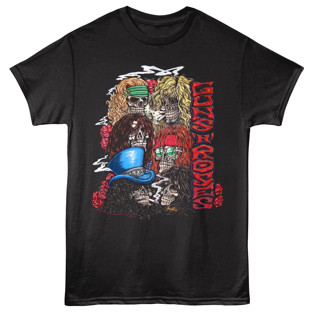 Not just another LA rock band, Guns n’ Roses helped us past the glam rock of the 80’s and reinvented the power ballad. Nearly 40 years later, this punk rock and heavy metal band is still rocking hard with upcoming tours! From Appetite for Destruction to Chinese Democracy, they’ve sold over 100 million records worldwide, earning their spot as one of the best-selling bands ever. With hits like “Sweet Child o’ Mine,” “Welcome to the Jungle,” and “Paradise City,” Guns N’ Roses made the power ballad cool again. Frontman Axl Rose’s raw energy, Slash is a world-renowned guitarist with Duff McKagan on bass, they became the “most dangerous band in the world”. Rock some history with this Guns N’ Roses Band Skulls T-Shirt, it has a vintage finish so it looks like you got it from a gig in the 90’s.