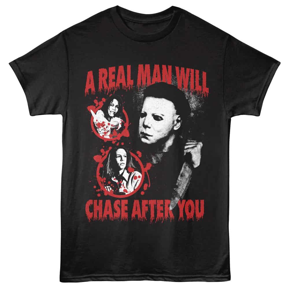 This epic Horror franchise that spawned them all! The Halloween horror franchise consists of 11 films, as well as novels, comic books, a video game, not to mention the masks! Serial killer Michael Myers who was committed to a sanitarium as a child, escapes to stalk and kill the people in his hometown of Haddonfield, Illinois. Michael Myers killings occur on Halloween night which is where the name comes from obviously. The Halloween franchise has inspired a long line of slasher films and the original “final girl“ in Laurie Strode (played by Jamie Lee Curtis). For all vintage horror fans this graphic Halloween a Real Man will Chase After You T-Shirt captures all the vintage grittiness of the 1978 original movie.