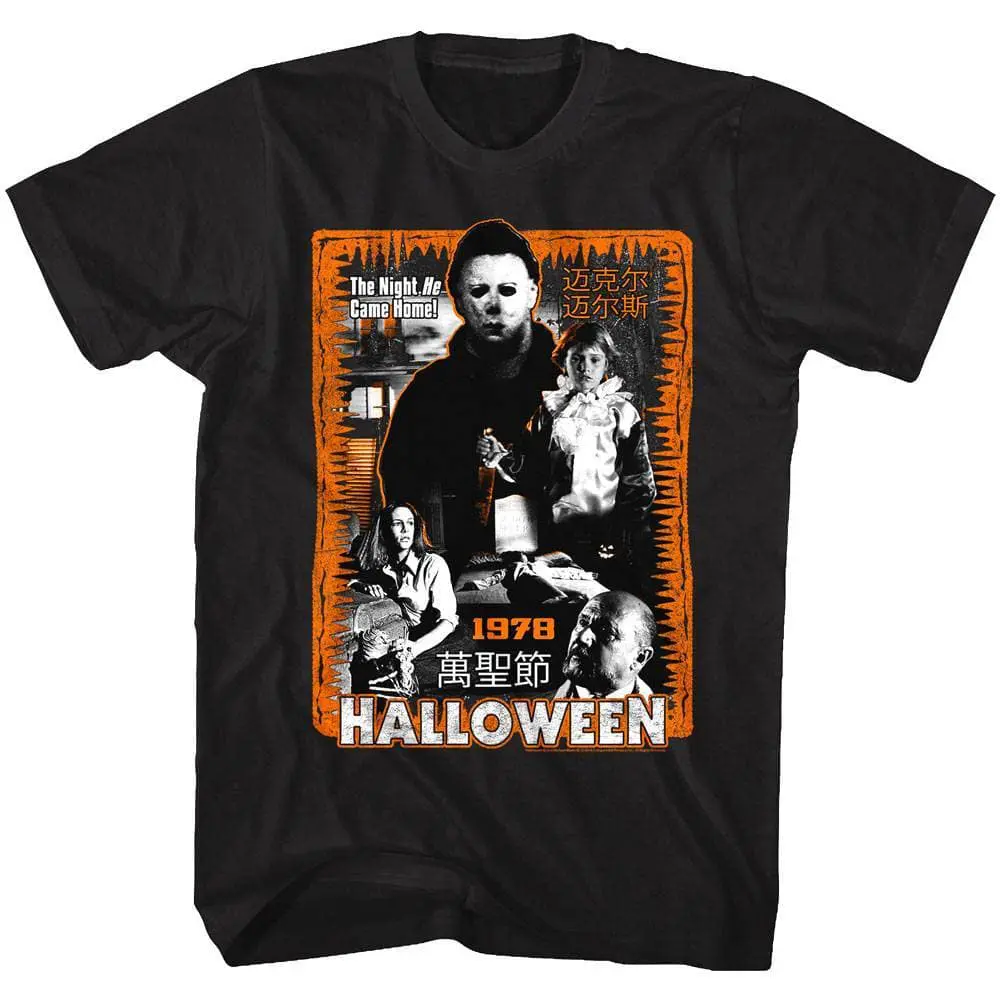 This epic Horror franchise that spawned them all! The Halloween horror franchise consists of 11 films, as well as novels, comic books, a video game, not to mention the masks! Serial killer Michael Myers who was committed to a sanitarium as a child, escapes to stalk and kill the people in his hometown of Haddonfield, Illinois. Michael Myers killings occur on Halloween night which is where the name comes from obviously. The Halloween franchise has inspired a long line of slasher films and the original “final girl“ in Laurie Strode (played by Jamie Lee Curtis). For all vintage horror fans this graphic Halloween Chinese Movie Poster 1978 T-Shirt captures all the vintage grittiness of the 1978 original movie.