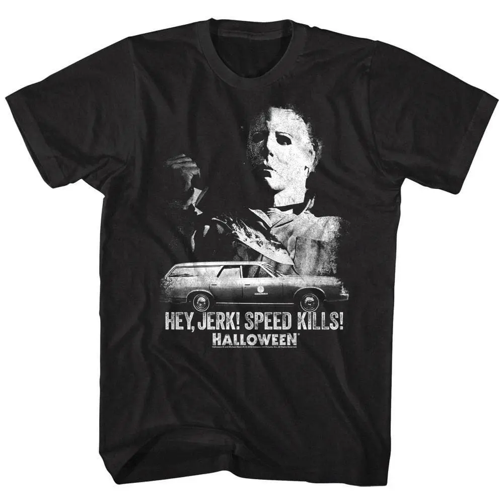 This epic Horror franchise that spawned them all! The Halloween horror franchise consists of 11 films, as well as novels, comic books, a video game, not to mention the masks! Serial killer Michael Myers who was committed to a sanitarium as a child, escapes to stalk and kill the people in his hometown of Haddonfield, Illinois. Michael Myers killings occur on Halloween night which is where the name comes from obviously. The Halloween franchise has inspired a long line of slasher films and the original “final girl“ in Laurie Strode (played by Jamie Lee Curtis). For all vintage horror fans this graphic Halloween Hey Jerk Speed Kills T-Shirt captures all the vintage grittiness of the 1978 original movie.