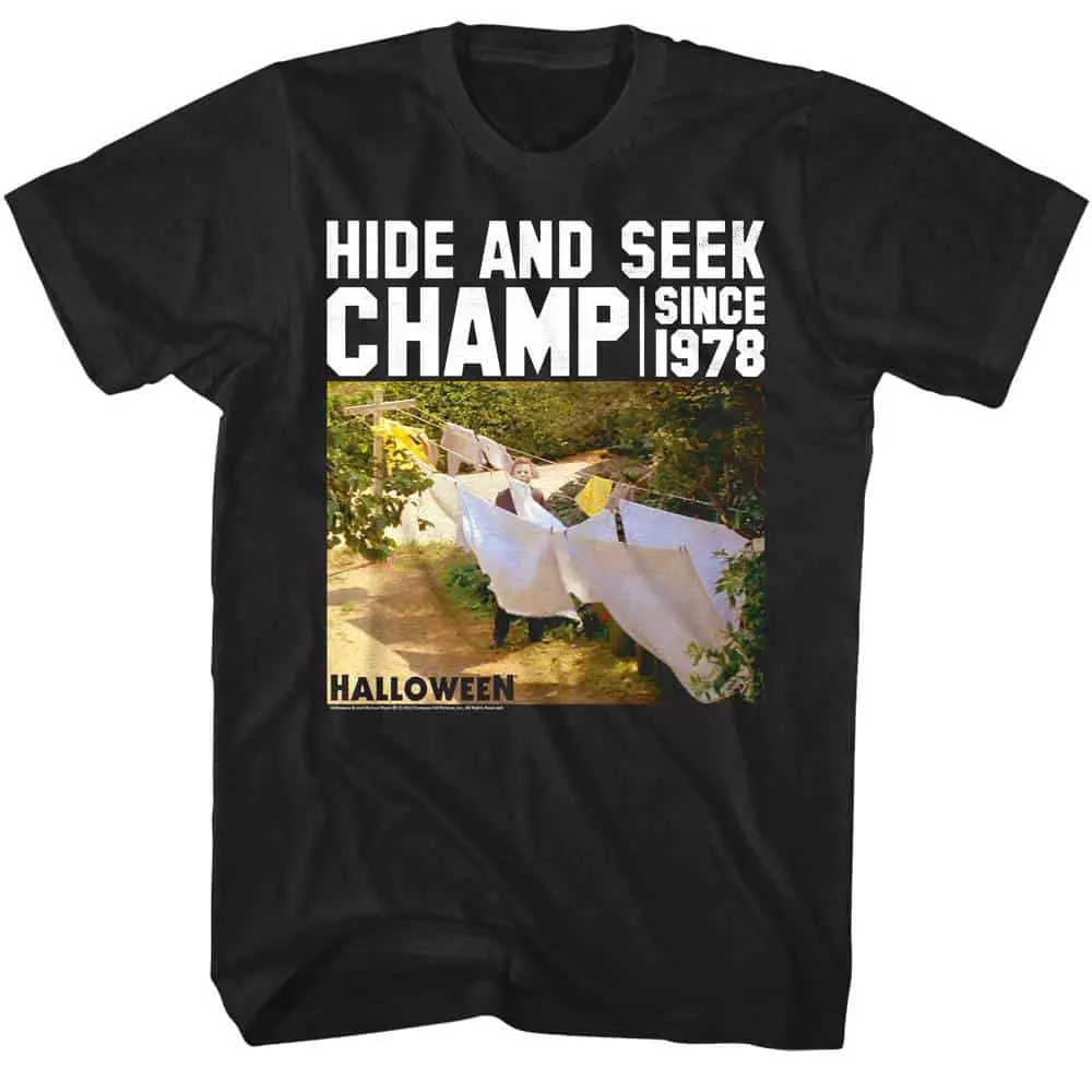This epic Horror franchise that spawned them all! The Halloween horror franchise consists of 11 films, as well as novels, comic books, a video game, not to mention the masks! Serial killer Michael Myers who was committed to a sanitarium as a child, escapes to stalk and kill the people in his hometown of Haddonfield, Illinois. Michael Myers killings occur on Halloween night which is where the name comes from obviously. The Halloween franchise has inspired a long line of slasher films and the original “final girl“ in Laurie Strode (played by Jamie Lee Curtis). For all vintage horror fans this graphic Halloween Hide & Seek Champ Laundry T-Shirt captures all the vintage grittiness of the 1978 original movie.
