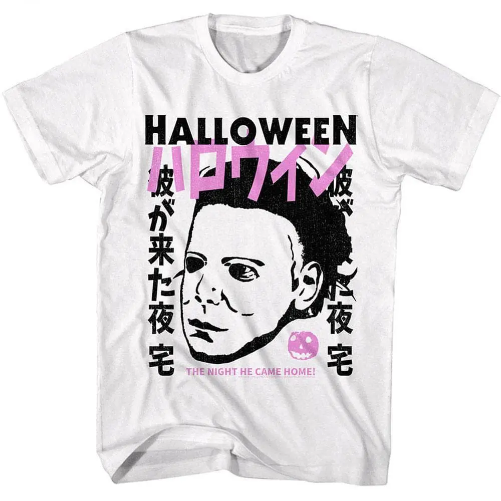 This epic Horror franchise that spawned them all! The Halloween horror franchise consists of 11 films, as well as novels, comic books, a video game, not to mention the masks! Serial killer Michael Myers who was committed to a sanitarium as a child, escapes to stalk and kill the people in his hometown of Haddonfield, Illinois. Michael Myers killings occur on Halloween night which is where the name comes from obviously. The Halloween franchise has inspired a long line of slasher films and the original “final girl“ in Laurie Strode (played by Jamie Lee Curtis). For all vintage horror fans this graphic Halloween Michael in Japanese T-Shirt captures all the vintage grittiness of the 1978 original movie.