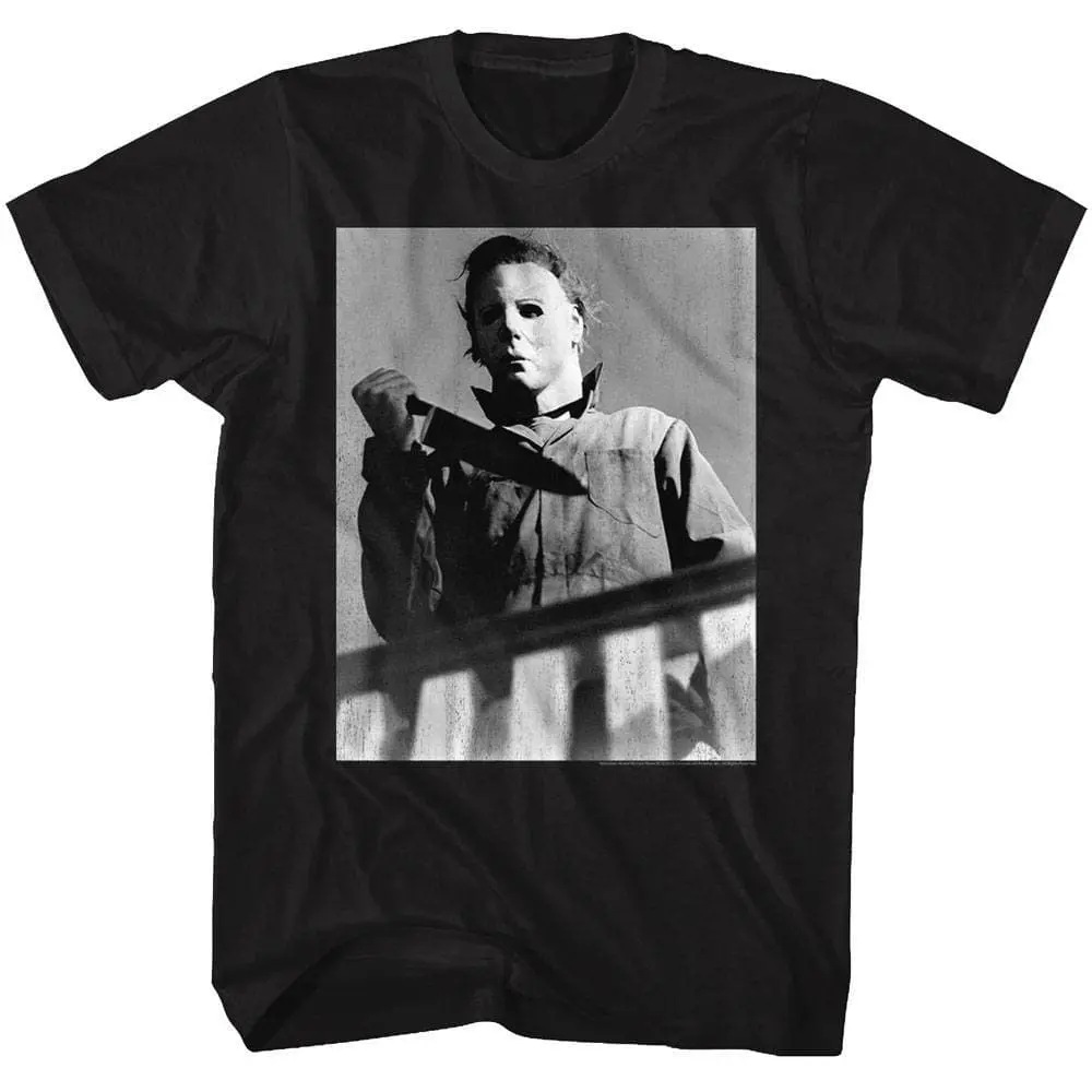 This epic Horror franchise that spawned them all! The Halloween horror franchise consists of 11 films, as well as novels, comic books, a video game, not to mention the masks! Serial killer Michael Myers who was committed to a sanitarium as a child, escapes to stalk and kill the people in his hometown of Haddonfield, Illinois. Michael Myers killings occur on Halloween night which is where the name comes from obviously. The Halloween franchise has inspired a long line of slasher films and the original “final girl“ in Laurie Strode (played by Jamie Lee Curtis). For all vintage horror fans this graphic Halloween Michael Myers Waiting Upstairs T-Shirt captures all the vintage grittiness of the 1978 original movie.
