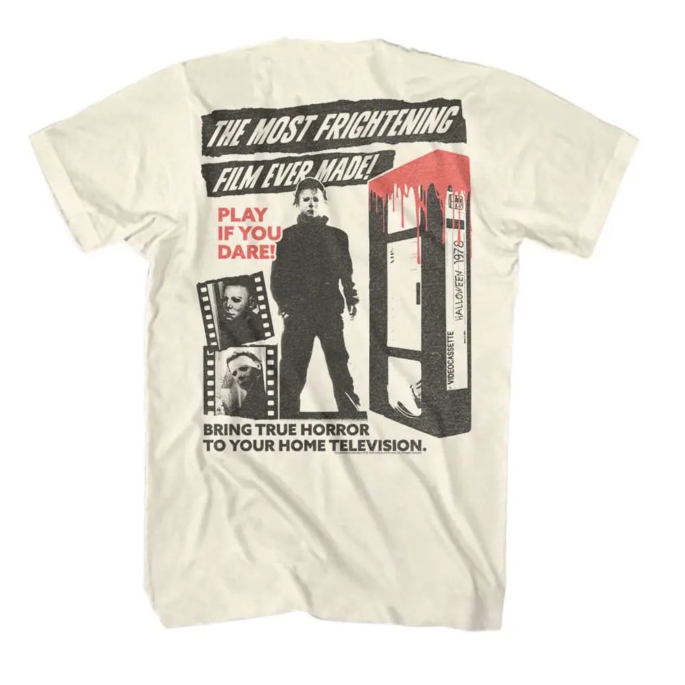 This epic Horror franchise that spawned them all! The Halloween horror franchise consists of 11 films, as well as novels, comic books, a video game, not to mention the masks! Serial killer Michael Myers who was committed to a sanitarium as a child, escapes to stalk and kill the people in his hometown of Haddonfield, Illinois. Michael Myers killings occur on Halloween night which is where the name comes from obviously. The Halloween franchise has inspired a long line of slasher films and the original “final girl“ in Laurie Strode (played by Jamie Lee Curtis). For all vintage horror fans this graphic Halloween Most Frightening Film Ever Made T-Shirt captures all the vintage grittiness of the 1978 original movie.