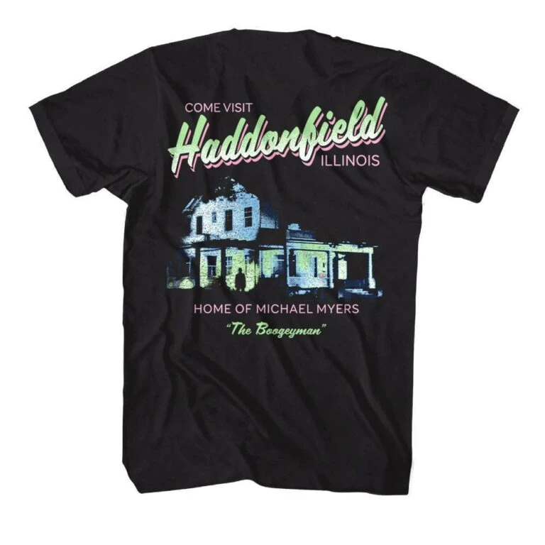 This epic Horror franchise that spawned them all! The Halloween horror franchise consists of 11 films, as well as novels, comic books, a video game, not to mention the masks! Serial killer Michael Myers who was committed to a sanitarium as a child, escapes to stalk and kill the people in his hometown of Haddonfield, Illinois. Michael Myers killings occur on Halloween night which is where the name comes from obviously. The Halloween franchise has inspired a long line of slasher films and the original “final girl“ in Laurie Strode (played by Jamie Lee Curtis). For all vintage horror fans this graphic Halloween Visit Haddonfield Illinois T-Shirt captures all the vintage grittiness of the 1978 original movie.