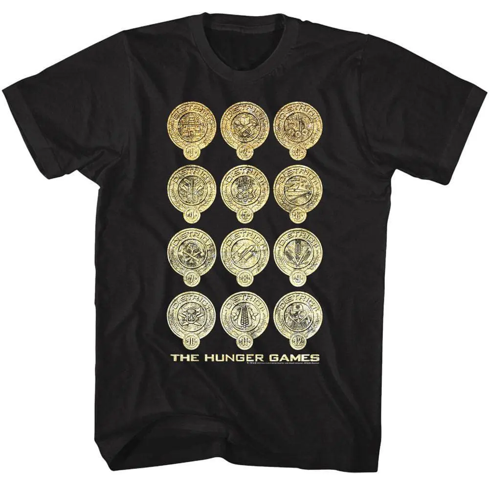 Following the release of Suzanne Collins’s novel The Hunger Games in 2008, Hollywood studios began adapting the book into film. The trilogy that followed grossed over $3 billion. Leading an all-star cast is Jennifer Lawrence as Katniss Everdeen who volunteers to compete in the Hunger Games: a nationally televised event in which the ‘tributes’ fight each other to the death until one survivor remains. I won’t spoil it, but Katniss stars in all 4 movies! The 5th Hunger Games movie released in 2023 is the much-anticipated prequel. Whether your a fan of the awesome movies or the ground-breaking books, this Hunger Games Gold District Badges T-Shirt will make you stand out from the rest.