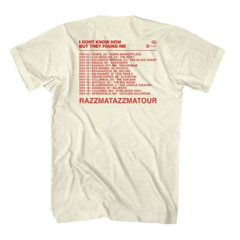 To give them their full name, I Dont Know How But They Found Me is usually written as iDKHOW are an indie pop solo project based in Salt Lake City, Utah, fronted by singer-songwriter Dallon Weekes. The band’s style has mainly been described as indie pop, Weekes has also described their musical style as indie pop, as well as “hipster nonsense” and “Glam Wham” or even “electro pop rock”, and a pop rock-influenced mix of “sixties garage, seventies glam, eighties new wave, and the early days of Britpop” – we call them indescribable. So how would you describe this graphic IDKHow Razzmatazzma Tour Listings t-shirt?