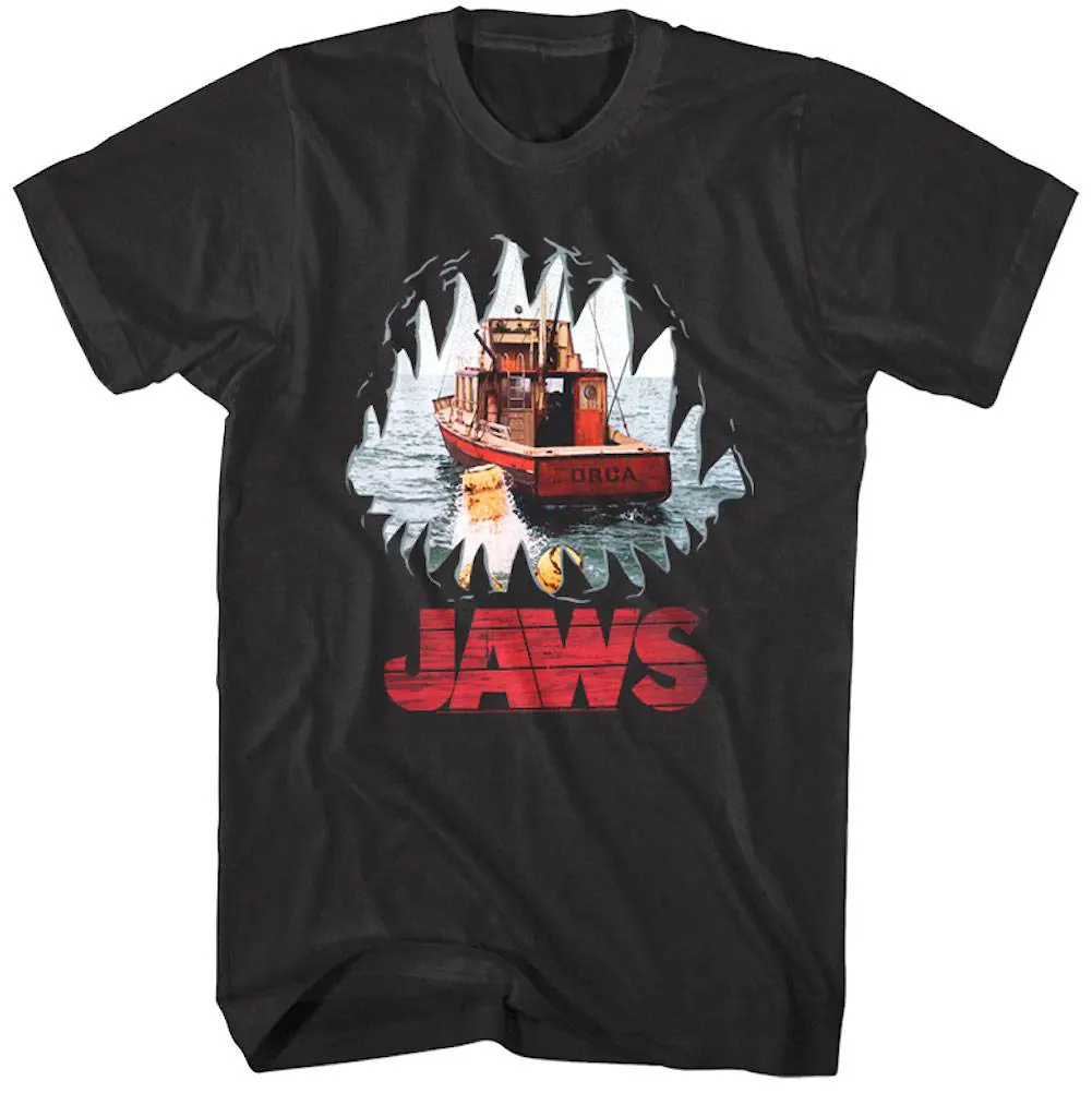 If you don’t know Jaws then where have you been hiding? This was the original blockbuster movie back in 1975 that launched this shark-based, natural horror movie series with a bang – in fact no horror movie had such a mainstream impact before. Celebrating it’s 50th Anniversary, the first Jaws movie is about a great white shark who attacks people off the coast of Amity Island, New England. The original Jaws film was based on the novel by Peter Benchley which itself was inspired by shark attacks in the rivers around New York and Massachusetts. If you love Shark week then this Jawesome graphic Jaws Shark Mouth POV T-Shirt will help you navigate Great White’s – just stay outta the water!