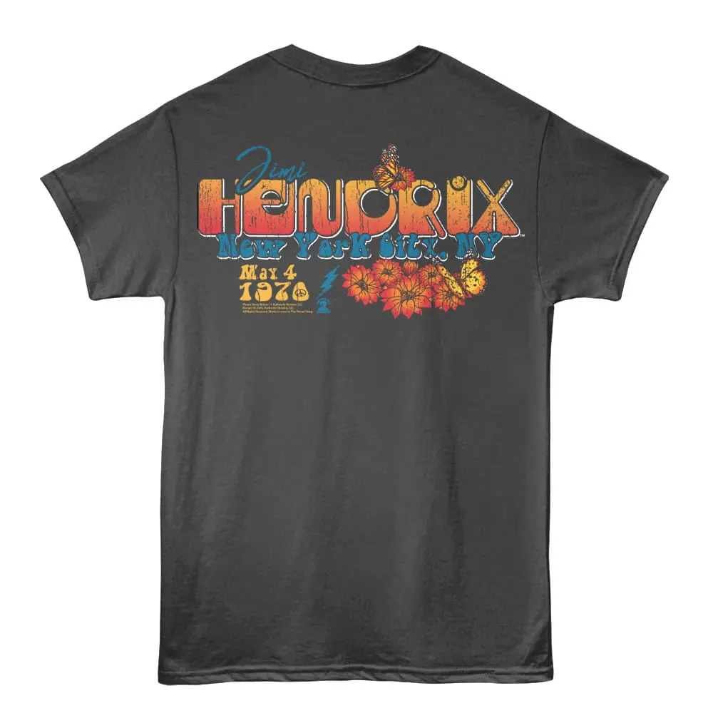 An iconic rock legend and founding member of the tragic 27 club. Jimi Hendrix was light years ahead of his time both musically and as a trendsetter, Jimi’s trademark look, hairstyle and fashion sense inspired a whole generation of Woodstock attendees. The Jimi Hendrix Experience blazed a trail in the 60’s and he famously headlined Woodstock and the Isle of Wight festival before tragically dying in 1970. Hendrix has been referred to as one of the most important and influential guitarists of all time – he ranked first in Rolling Stone’s list of the “100 Greatest Guitarists of All Time“. His music and image endures and this awesome Jimi Hendrix New York 1970 t-shirt captures his vibe and has a vintage look that brings you back to that legendary rock heyday.