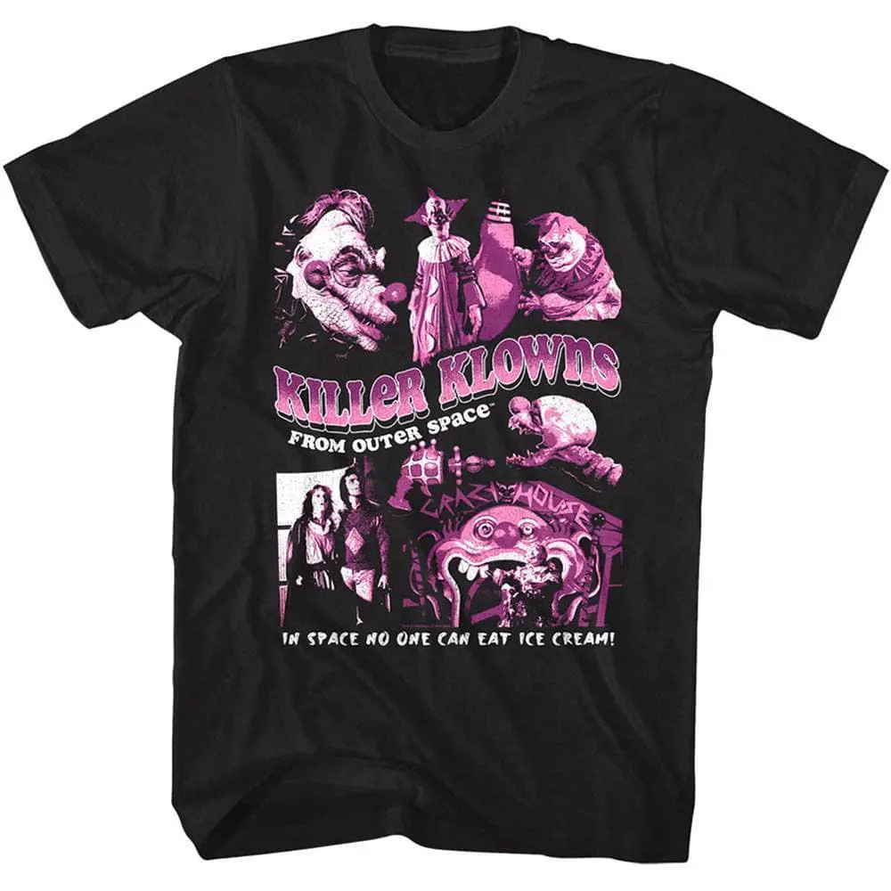 How else to describe the kitsch horror classic Killer Klowns from Outer Space than a science fiction spoof horror comedy film from 1988. Killer Klowns is about a clan of evil aliens who look like circus clowns that come from outer space in order to capture, kill and terrorize a small town to get sustenance. The crazy clown aliens use popcorn guns and lifesize balloon animals to attack their prey. This kitschy movie weirdness has become the ultimate example of a cult classic. So if you have friends with coulrophobia (fear of clowns obviously), then they will love you even more if you wear this Killer Klowns from Outer Space Collage t-shirt!
