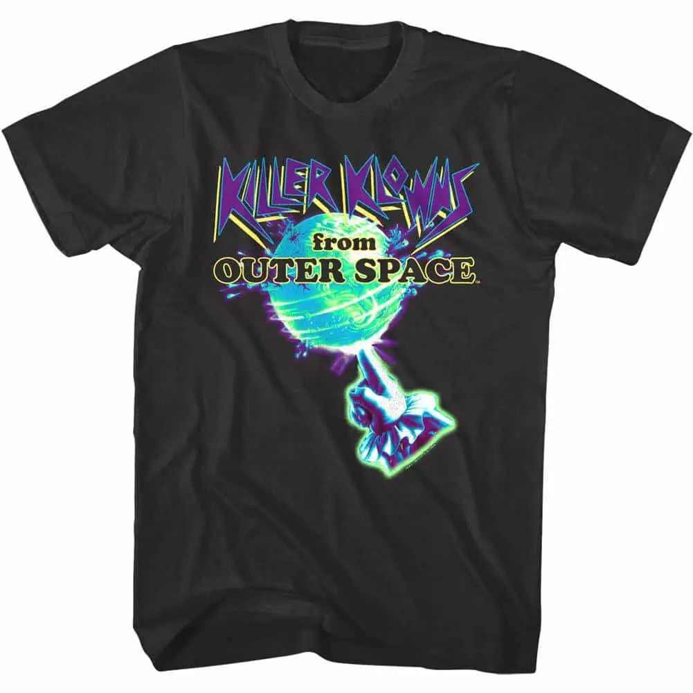 How else to describe the kitsch horror classic Killer Klowns from Outer Space than a science fiction spoof horror comedy film from 1988. Killer Klowns is about a clan of evil aliens who look like circus clowns that come from outer space in order to capture, kill and terrorize a small town to get sustenance. The crazy clown aliens use popcorn guns and lifesize balloon animals to attack their prey. This kitschy movie weirdness has become the ultimate example of a cult classic. So if you have friends with coulrophobia (fear of clowns obviously), then they will love you even more if you wear this Killer Klowns from Outer Space Neon Globe Spinning t-shirt!