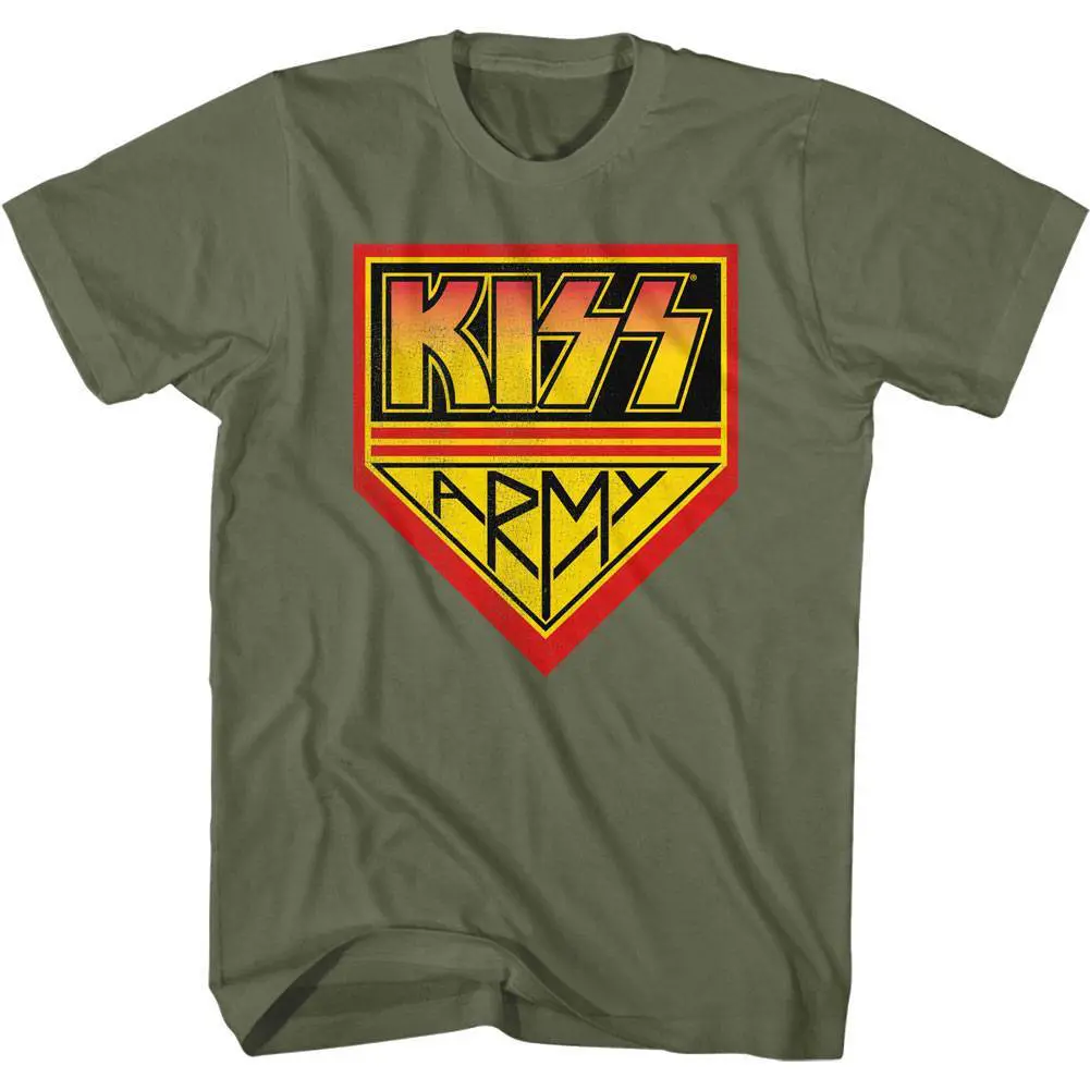 KISS are not simply a rock band, they are a movement! They are known for its members’ face paint and stage outfits, and their elaborate live performances, which featured fire breathing, blood-spitting, smoking guitars, shooting rockets, levitating drum kits, and pyrotechnics – and their VERY loyal fanbase, the Kiss Army. With their make-up and costumes, KISS took on the persona of comic book-style characters: the Starchild (Paul Stanley), The Demon (Gene Simmons), the Spaceman (Ace Frehley), and The Catman (Peter Criss). Kiss is one of the best-selling bands of all time, having sold more than 100 million records worldwide, earning 30 Gold albums. Their distinct style and brash graphics are captured perfectly on this awesome Kiss Army Fan Club Military T-Shirt, with a vintage style to look like it came from the ’70s.