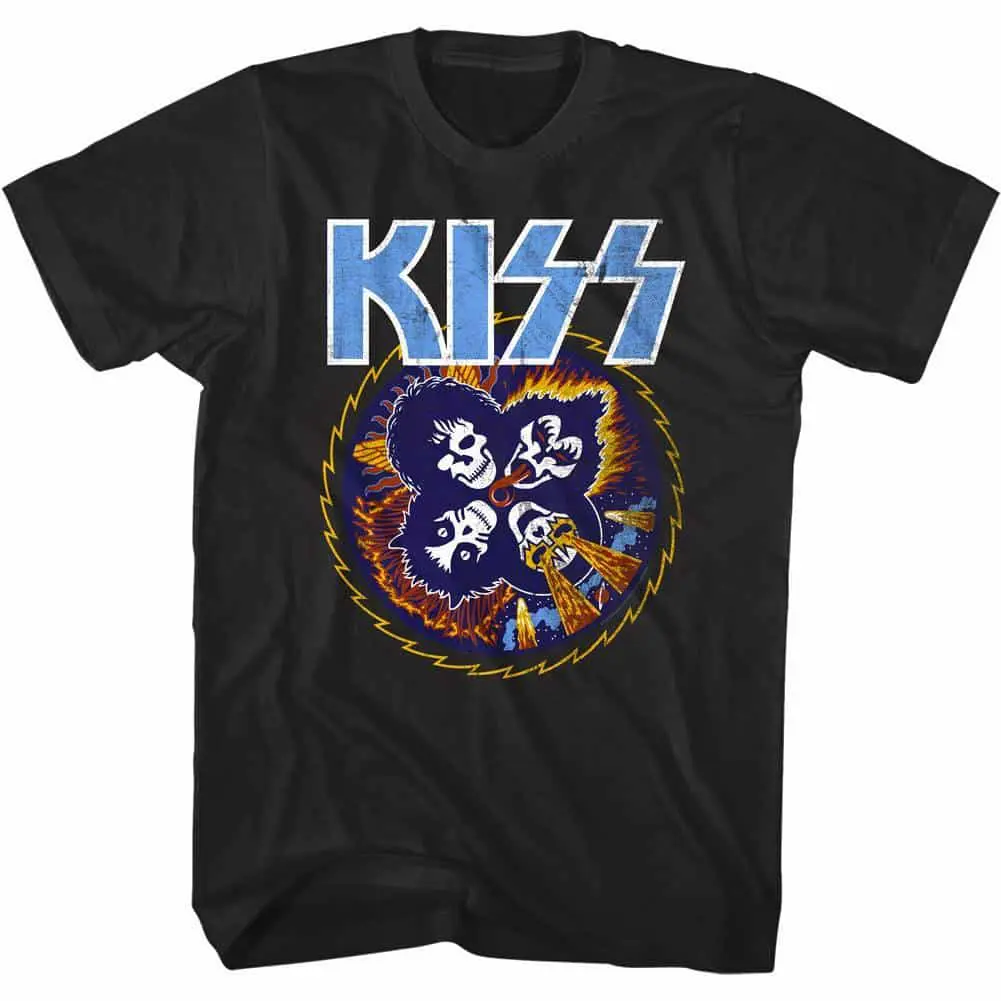 KISS are not simply a rock band, they are a movement! They are known for its members’ face paint and stage outfits, and their elaborate live performances, which featured fire breathing, blood-spitting, smoking guitars, shooting rockets, levitating drum kits, and pyrotechnics – and their VERY loyal fanbase, the Kiss Army. With their make-up and costumes, KISS took on the persona of comic book-style characters: the Starchild (Paul Stanley), The Demon (Gene Simmons), the Spaceman (Ace Frehley), and The Catman (Peter Criss). Kiss is one of the best-selling bands of all time, having sold more than 100 million records worldwide, earning 30 Gold albums. Their distinct style and brash graphics are captured perfectly on this awesome Kiss Rock n Roll Over Tour T-Shirt, with a vintage style to look like it came from the ’70s.