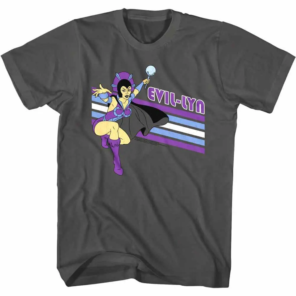 All kids of the 80’s remember Masters of the Universe, the epic toys and cartoon that pitched the armies of good against the hordes of evil. The original MotU focuses on the battle the heroic He-Man (the most powerful man in the universe and the secret identity of Prince Adam), against the evil sorcerer Skeletor on the planet Eternia. The popularity of the huge cast of supporting characters led to a spin-off starring He-Man‘s sister – She-Ra, Princess of Power. Did you know that Masters of the Universe started life as a collection of toys before it became a comic, cartoon and then movie. So if you ever had a Masters of the Universe action figure then, by the power of Grayskull, you will love this amazing graphic Masters of the Universe Evil-Lyn Retro Stripes t-shirt.