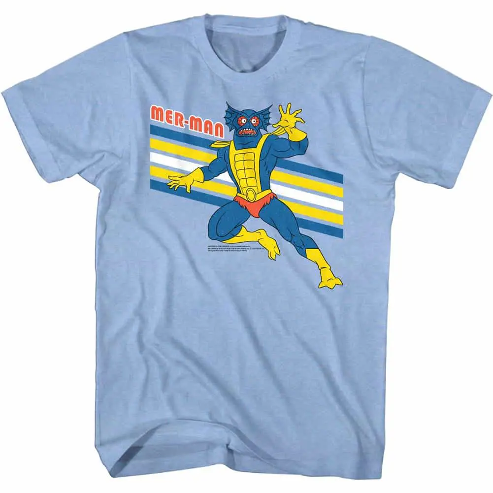All kids of the 80’s remember Masters of the Universe, the epic toys and cartoon that pitched the armies of good against the hordes of evil. The original MotU focuses on the battle the heroic He-Man (the most powerful man in the universe and the secret identity of Prince Adam), against the evil sorcerer Skeletor on the planet Eternia. The popularity of the huge cast of supporting characters led to a spin-off starring He-Man‘s sister – She-Ra, Princess of Power. Did you know that Masters of the Universe started life as a collection of toys before it became a comic, cartoon and then movie. So if you ever had a Masters of the Universe action figure then, by the power of Grayskull, you will love this amazing graphic Masters of the Universe Mer-Man Retro Stripes t-shirt.