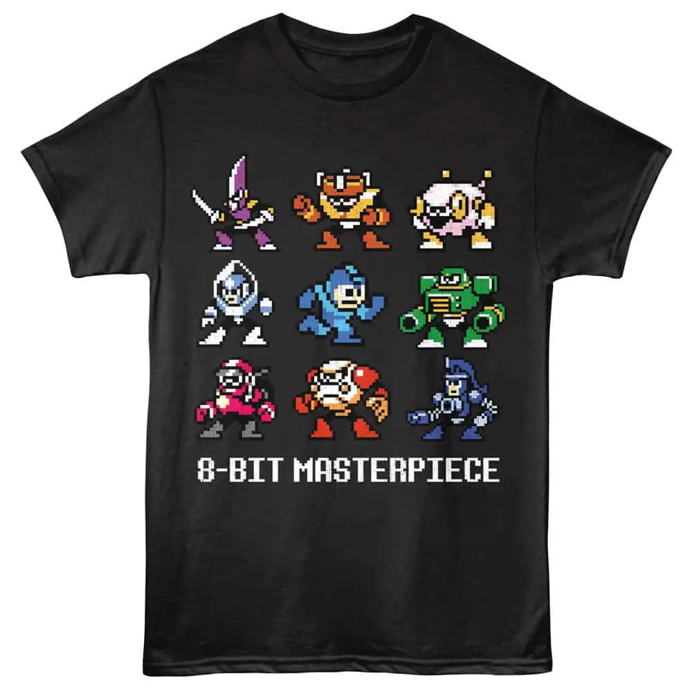 Capcom had yet another hit with Mega Man, who starred in a series of robot characters all known as Megaman (or Rokkuman in Japan). Having appeared on many gaming systems since his first appearance on NES Nintendo Entertainment System in 1987, Mega Man has had a wide gaming audience, but he is still battling the evil Dr Wily with his trusty pets. If you are a retro gamer then this vintage style graphic Megaman 8Bit Masterpiece t-shirt is for you, featuring your favorite old-school characters.