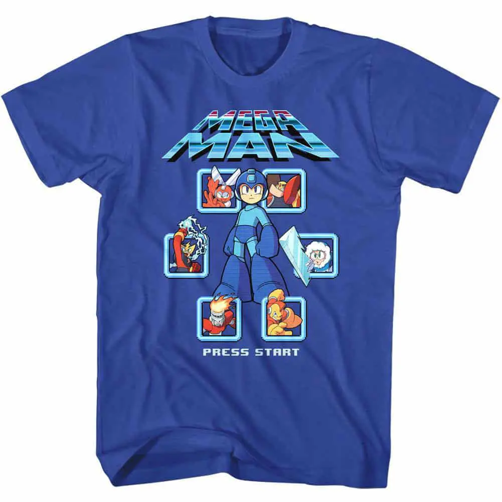 Capcom had yet another hit with Mega Man, who starred in a series of robot characters all known as Megaman (or Rokkuman in Japan). Having appeared on many gaming systems since his first appearance on NES Nintendo Entertainment System in 1987, Mega Man has had a wide gaming audience, but he is still battling the evil Dr Wily with his trusty pets. If you are a retro gamer then this vintage style graphic Megaman Start Screen t-shirt is for you, featuring your favorite old-school characters.
