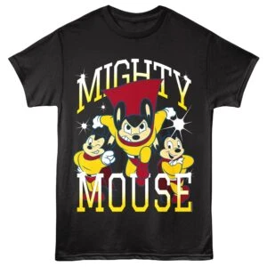 Here he comes to save the day and that means that Mighty Mouse is on the way! This superhero cartoon character was originally called Super Mouse, and made his debut in the 1942 short The Mouse of Tomorrow. The name was changed to Mighty Mouse in his eighth film and the character went on to star in 80 theatrical shorts. It’s the tale of an ordinary mouse with extraordinary powers – flying, super strength, heat vision, and speed with a degree of invulnerability. So if you feel like a vintage superhero then this super graphic Mighty Mouse Hero Flying t-shirt is just swell.