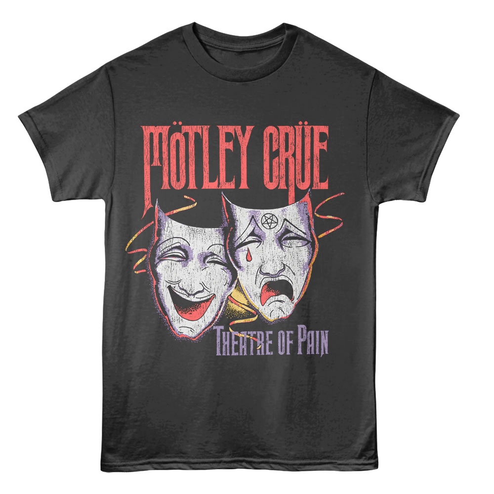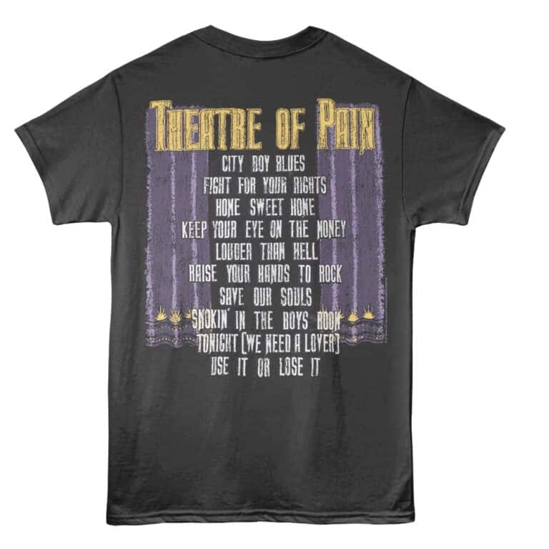The Saints of Los Angeles aka the Bad Boys of Hollywood are well known for their hedonistic lifestyle, Motley Crue is known for the rock lifestyle just as much as the rock music itself! From the heavy metal Shout at the Devil to the more glam Theater of Pain to the multi-platinum Dr Feelgood, the Crue are entertainers that change with the times. Motley Crue are true Heavy Metal showmen, known for their flame-thrower guitars, roller coaster drums and fireworks not to mention their trusty mascot, Allister Fiend. Grab some rock history first, this cool Motley Crue Theatre of Pain Tracklist T-Shirt is vintage style with a faded print so it looks as if you bought it at a show in the 80’s.