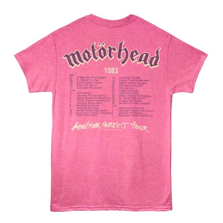 The legendary Lemmy Kilmister and his Motörhead band are considered the very beginning of the wave of British heavy metal (NWOBHM) in the 70’s. Motörhead were a power trio always featuring Lemmy, and though several guitarists and drummers have played in the line-up, most of their best-selling albums and singles feature drummer Phil “Philthy Animal” Taylor and guitarist “Fast” Eddie Clarke. Motorhead released 23 studio albums, 10 live recordings, 12 compilation albums and five EPs over a career spanning 40 years. Lemmy always said that the band are more than Rock n’ Roll but also encompass Punk, Rock and Heavy Metal and he always sang about important themes. So if you always have an Ace up your sleeve, this distressed Motorhead Another Perfect Tour 83 T-Shirt looks like you got it at a mosh pit in the 80’s.